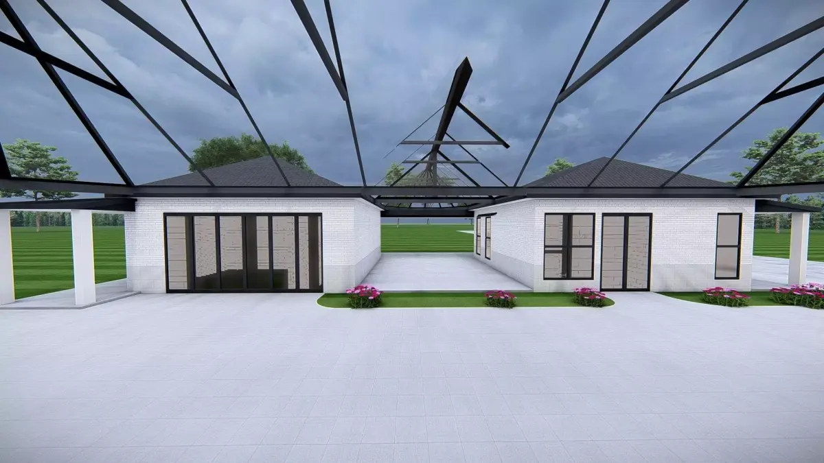 The design emphasizes open spaces, symmetry, and modern geometry. Large floor-to-ceiling glass doors and windows enhance interior visibility and outdoor connectivity. The covered walkway supported by slim pillars adds architectural elegance, while the landscaped courtyard with flowers and greenery introduces a touch of realism.