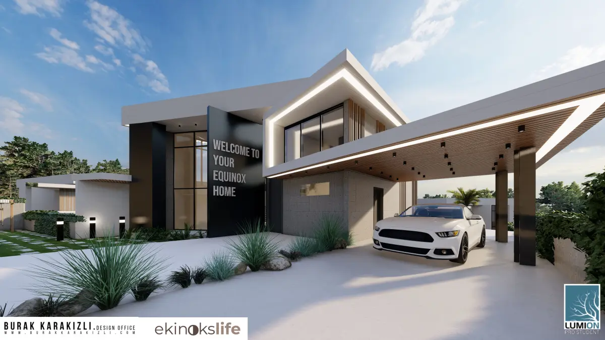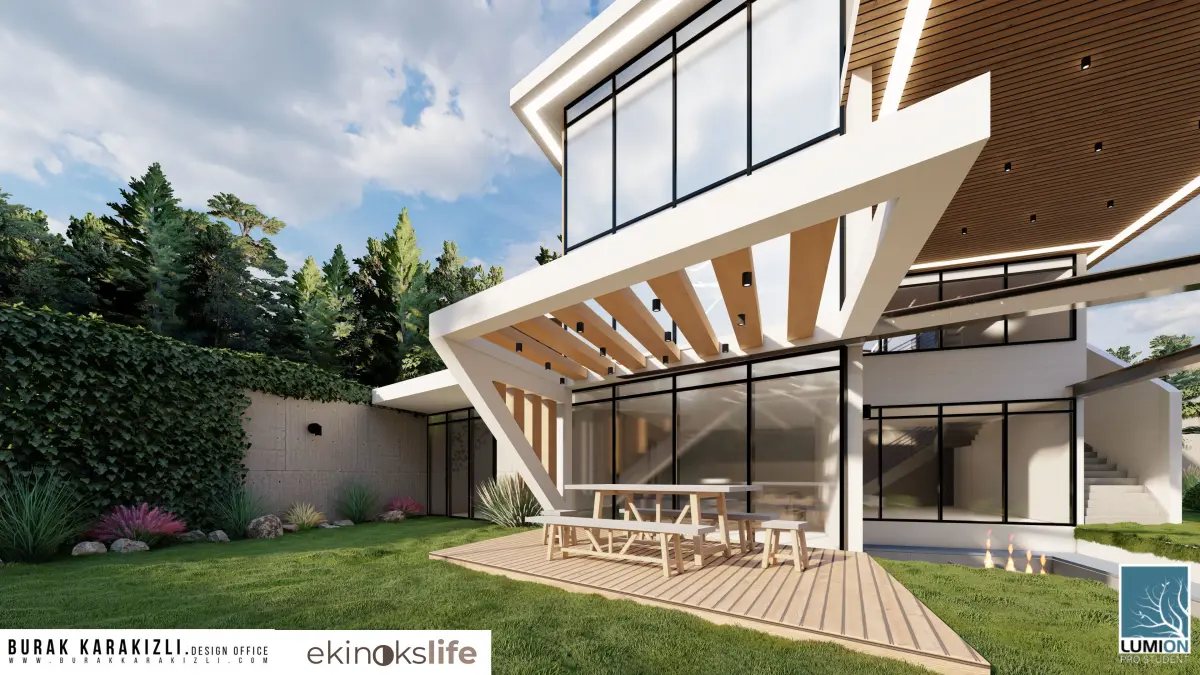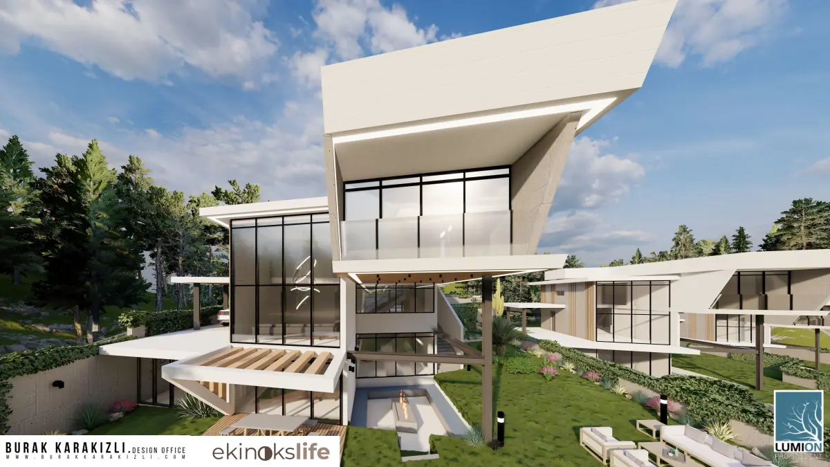 This 3D model presents a luxurious modern villa featuring a sophisticated design with expansive glass windows, natural wood accents, and a lush garden surrounding the pool area. The design includes an outdoor lounge and poolside relaxation area, perfect for high-end residential projects. Created with precision in Lumion, this 3D model highlights realistic textures, lighting, and modern architectural features. Ideal for architects, designers, and real estate developers looking to showcase premium residential properties.