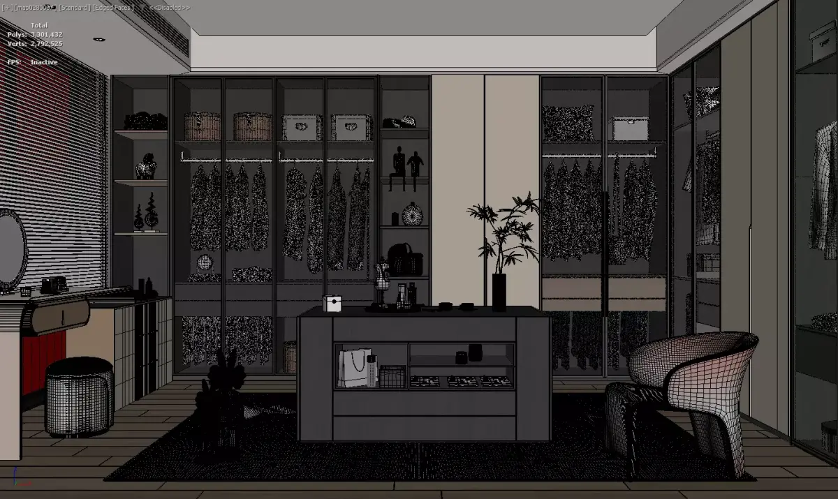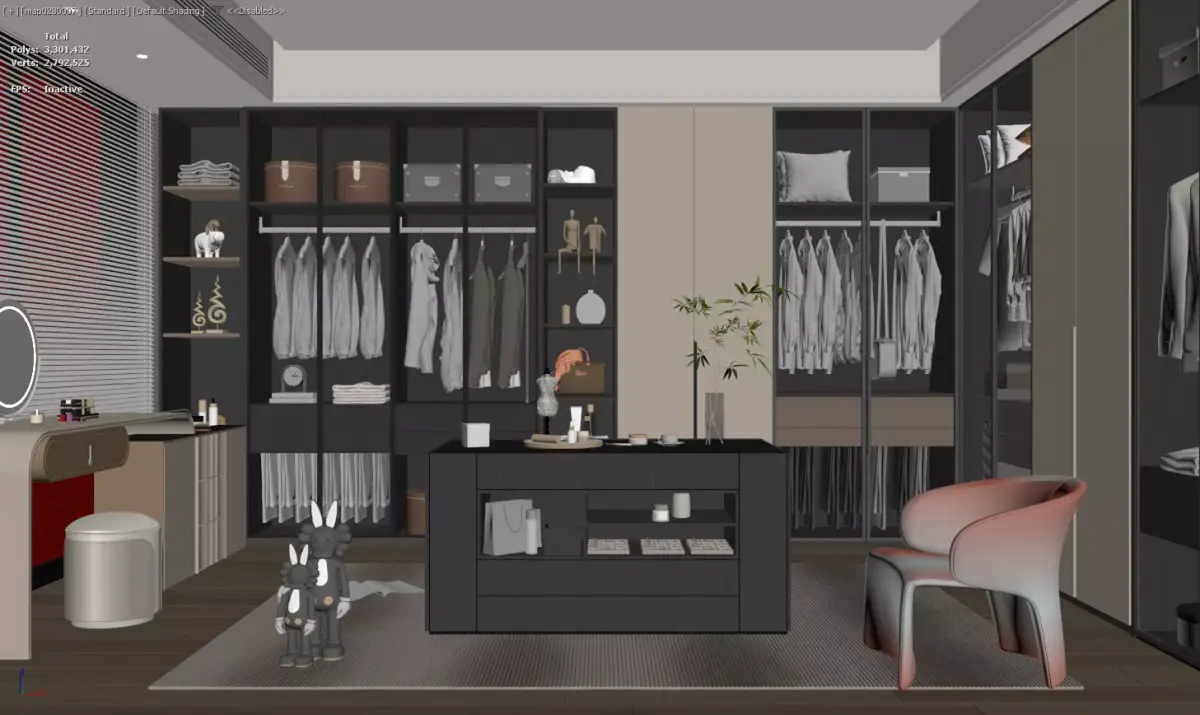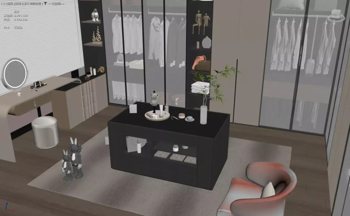 Modern luxury walk-in closet featuring custom built-in wardrobes with glass and wood finishes, ambient lighting, a dressing table with stool, a central storage island, and a stylish accent chair. Curated decor (sculptural figures, potted plant) and organized clothing/storage items enhance the space. Ideal for upscale homes, blending functional storage with high-end design for an elegant and efficient dressing experience.