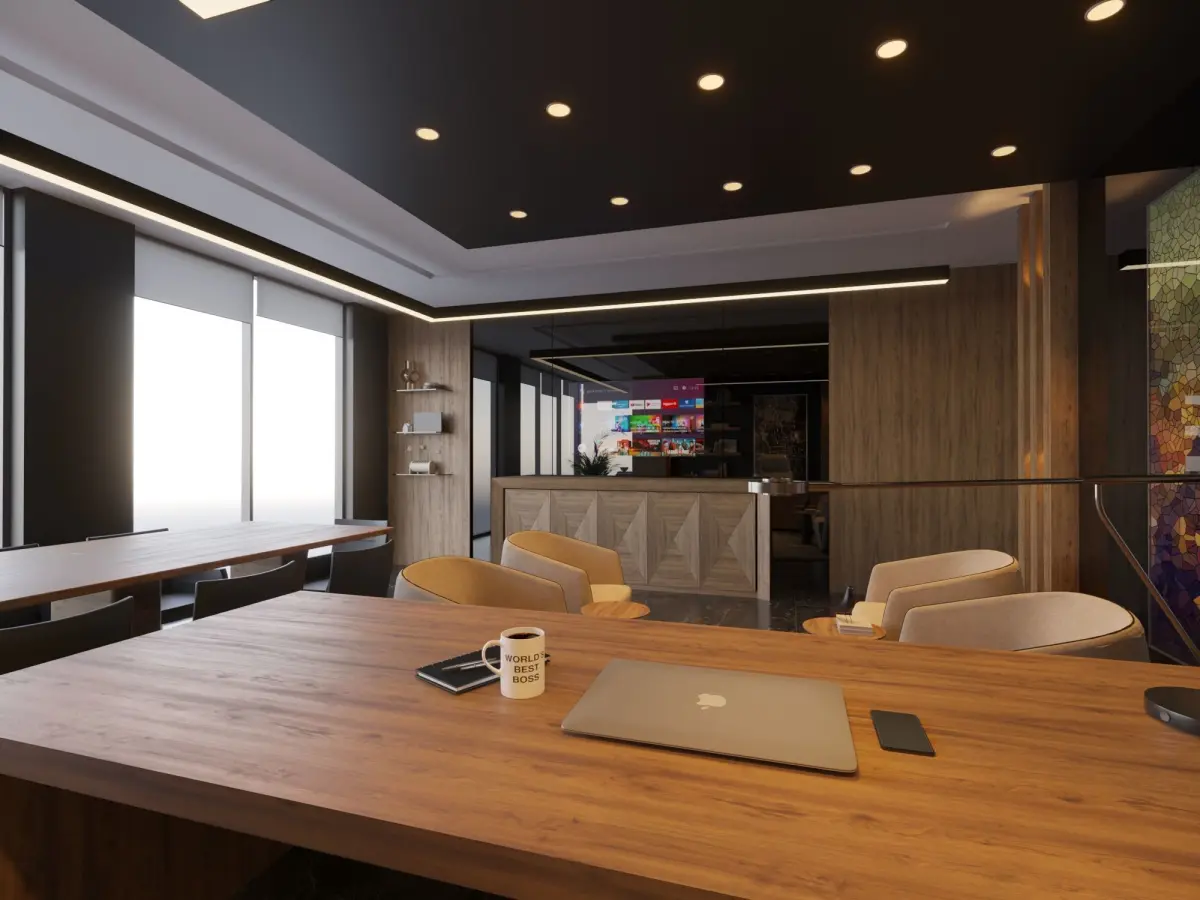 This 3D interior scene is a detailed design reflecting the stylish and professional atmosphere of a modern executive office. The room, where wood and black color tones are harmoniously used, features elegant and functional furniture and accessories. Designed with advanced rendering techniques, this scene offers perfect visuals from every angle and can be integrated into various types of projects.