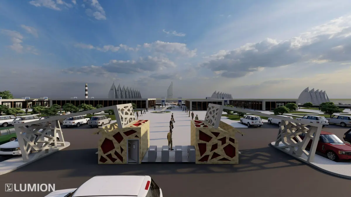 The model features dock structures, terminal buildings, landscape elements, access roads, and parking areas — perfectly suited for coastal urban design, harbor development, and waterfront planning projects.