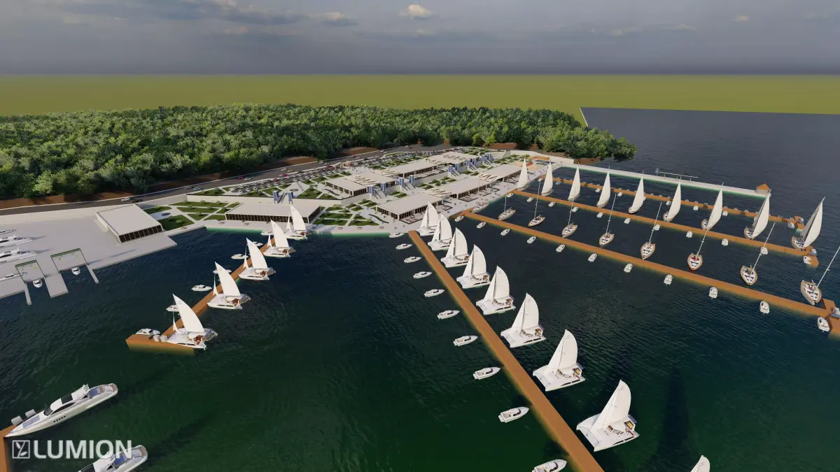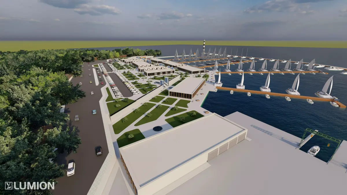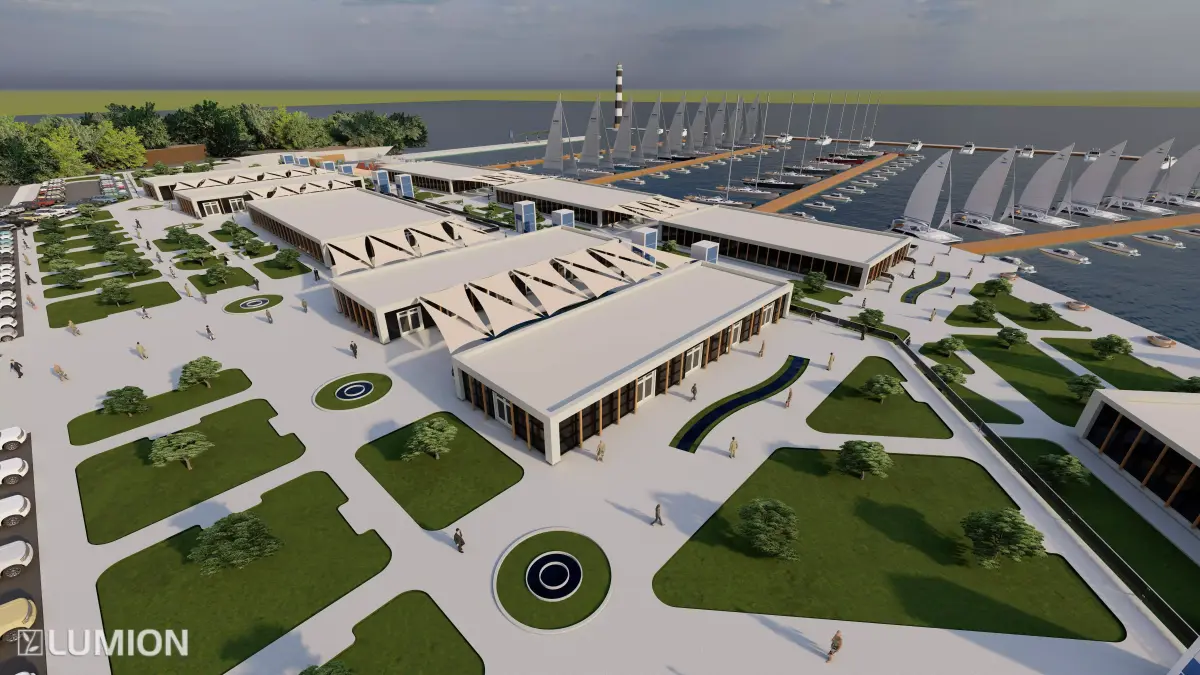 A detailed 3D model of a modern marina and waterfront terminal complex designed for architectural visualization, simulation, and VR environments.