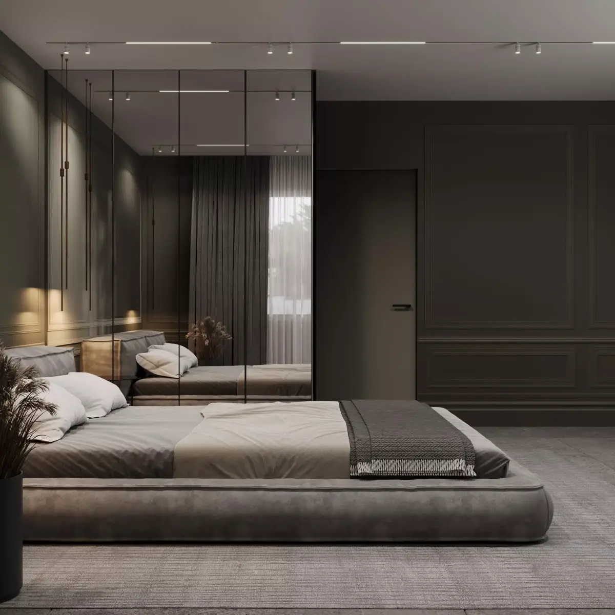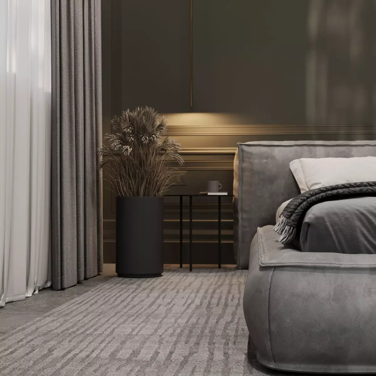This project showcases a modern master bedroom designed with a refined gray color palette that brings sophistication and calm to the space. The combination of minimal furniture, full-height curtains, and sleek linear lighting creates a luxurious yet welcoming atmosphere.The lighting setup is carefully managed for optimal rendering:Interior lights are enabled for the main camera angles.Decorative and ambient lights enhance depth and texture.