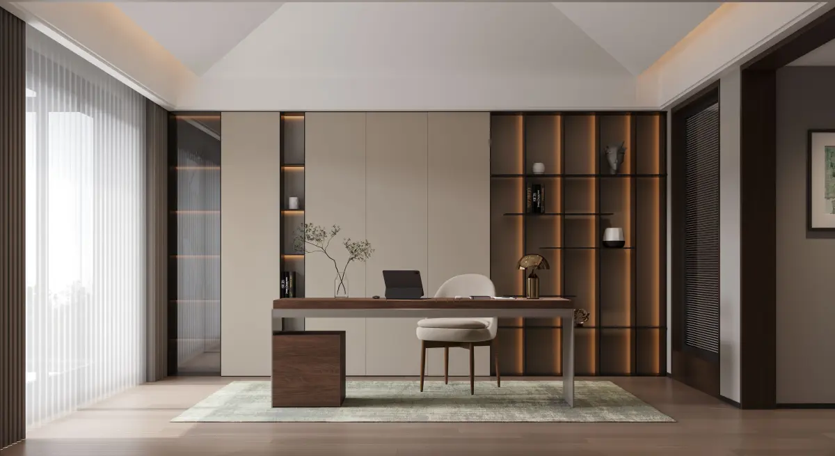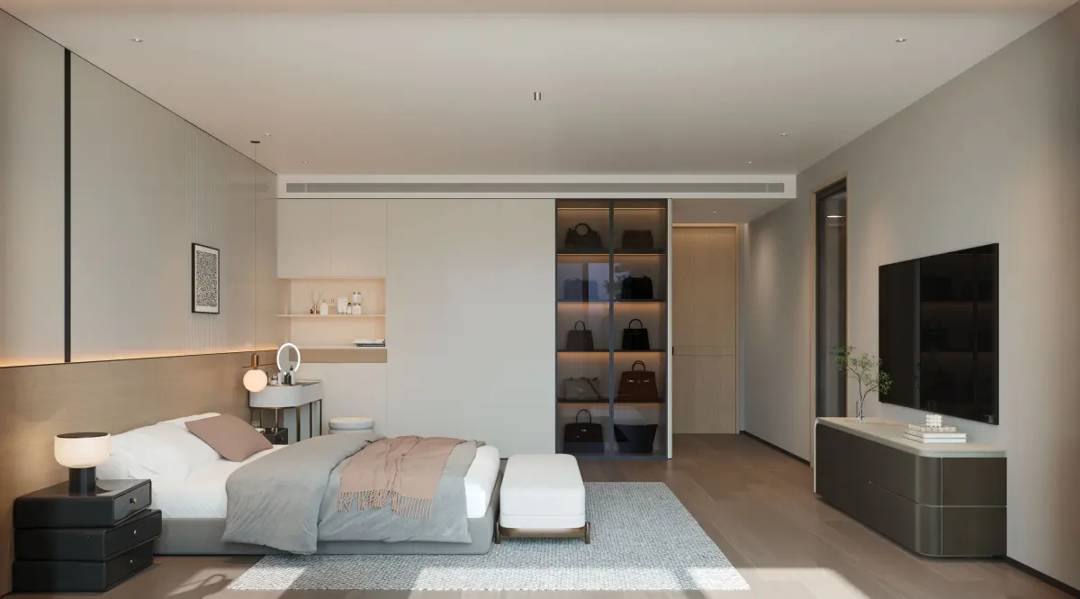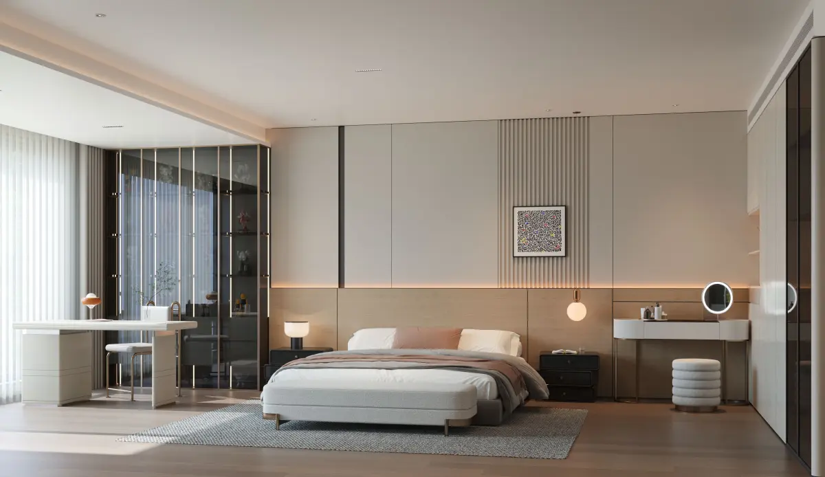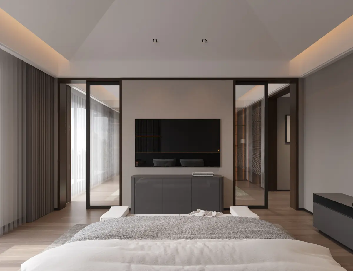 This 3D model showcases a modern master bedroom suite featuring a spacious sleeping area a cozy lounge corner and an en suite bathroom layout The design combines simplicity and comfort with soft neutral tones stylish furniture and warm lighting accents Ideal for interior renderings architectural visualization and virtual home staging