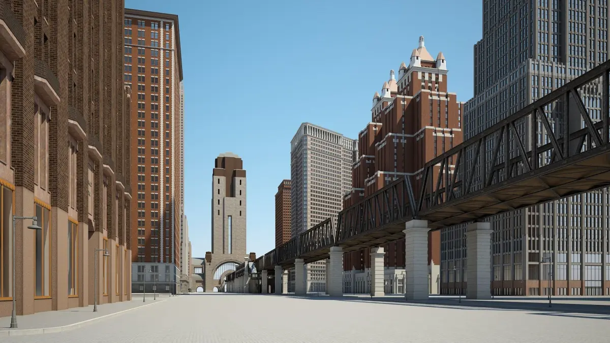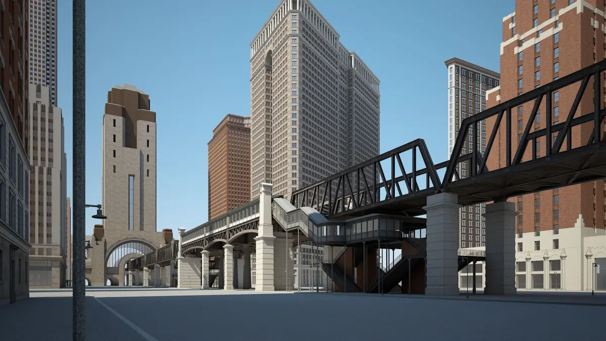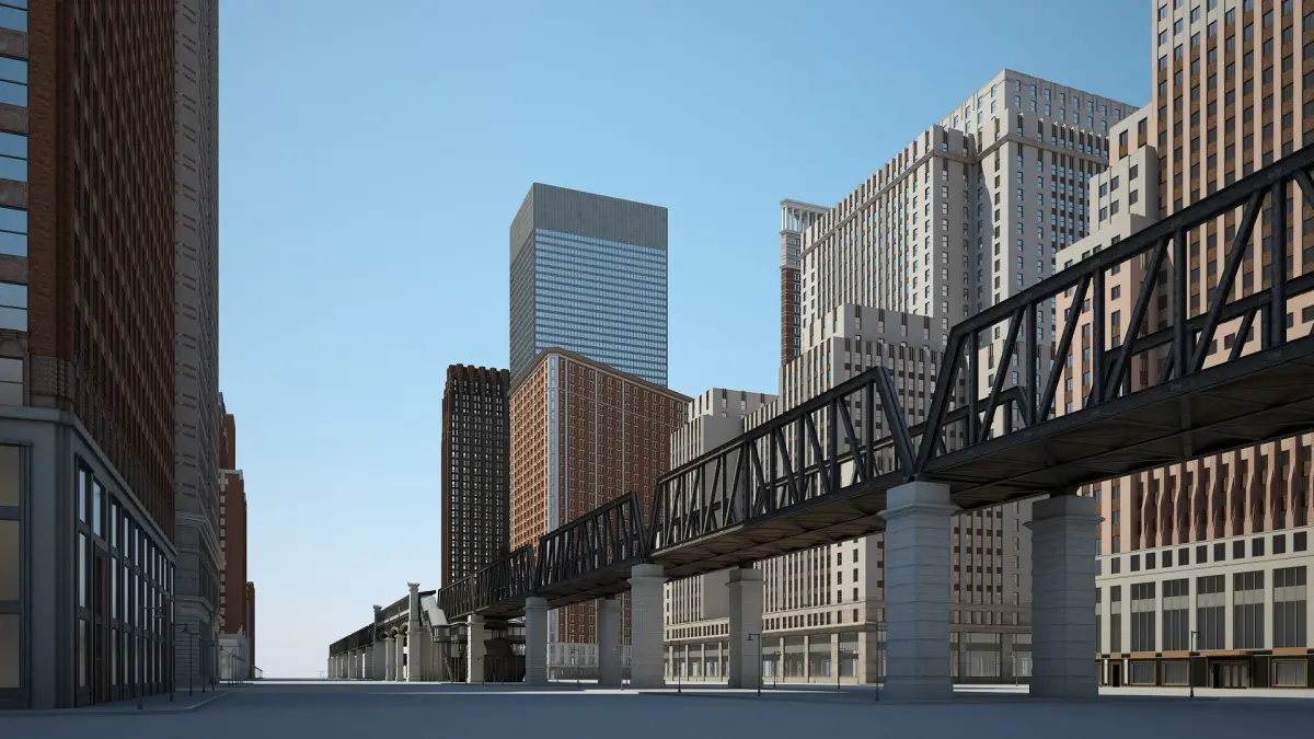 Detailed 3D model of a Modern American Metropolis. The model contains several skyscrapers, a train station and an elevated railway with station. Suitable for high resolution close-up. Real world scale.
