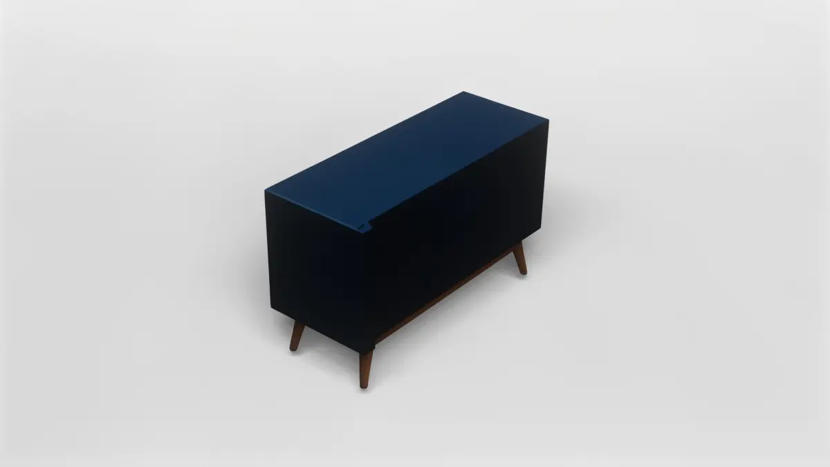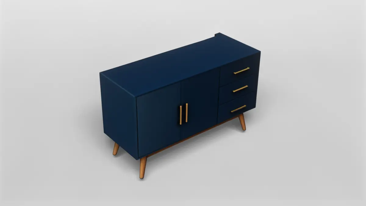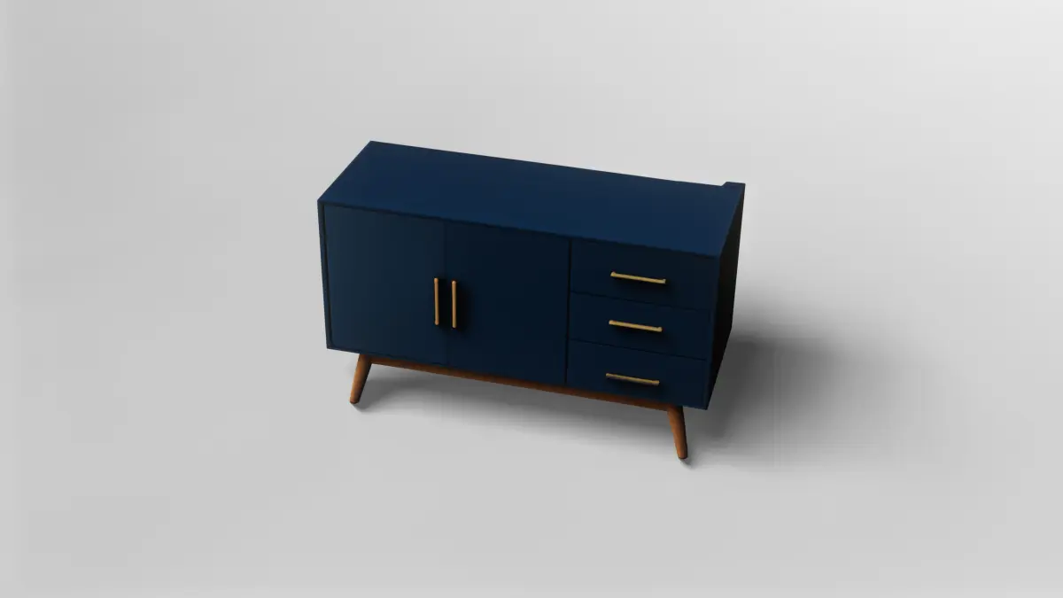 This 3D model represents a modern mid-century sideboard cabinet, featuring a sleek and minimalist design. The cabinet is finished in a deep navy blue color with elegant gold handles, which add a touch of sophistication and luxury to the piece. The structure is supported by angled wooden legs, staying true to the classic mid-century style and providing a warm contrast to the bold color of the cabinet body.The model includes two main cabinet doors on the left and three spacious drawers on the right, offering versatile storage options. The clean lines and smooth surfaces make this piece suitable for a variety of interior design styles, from contemporary to retro-inspired settings. The attention to detail in the model ensures that all elements, including the metallic handles and wood grain on the legs, are accurately represented.This 3D model is available for download in gmb format, with high-quality textures included to ensure realistic rendering in your projects. The textures are carefully mapped to highlight the contrast between the matte blue finish and the natural wood, as well as the subtle shine of the metal handles. This makes the model highly suitable for both close-up shots and broader interior scenes.Additionally, the model is provided in fbx format for compatibility with a wide range of 3D software and game engines. Whether you are working on architectural visualization, virtual staging, or game design, this sideboard cabinet model will add a touch of elegance and functionality to your digital interiors.
