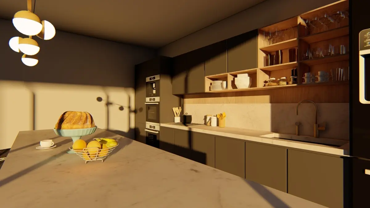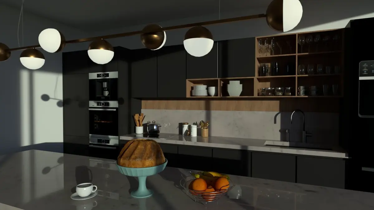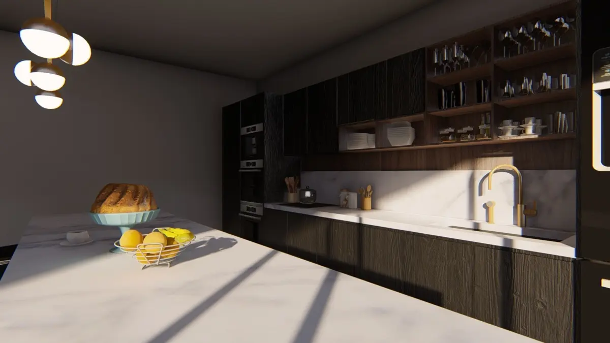 modern fully equipped kitchen with plenty of decorative elements such as glassware and tableware to give a more realistic vibe. Very detailed model by me with customized high quality materials for a better result. sketchup pro 2019 and vray next also the is FBX format file contact me for format conversion.