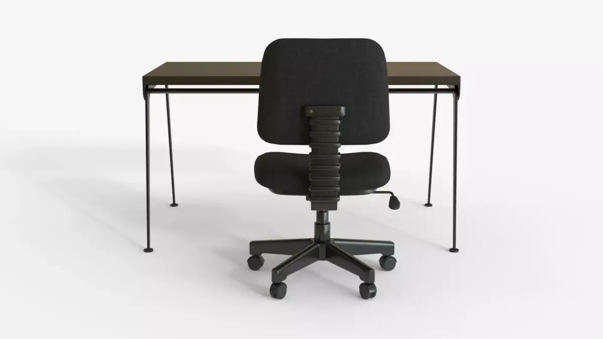 A sleek modern workspace setup featuring a slim metal-frame desk and two ergonomic office chairs with fabric cushions and adjustable bases. , his model designed with elegant detailing and premium PBR materials. Perfect for product visualization, marine design, games, AR/VR, and cinematic renders.