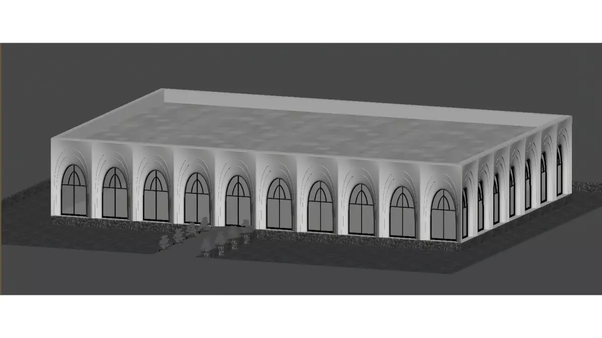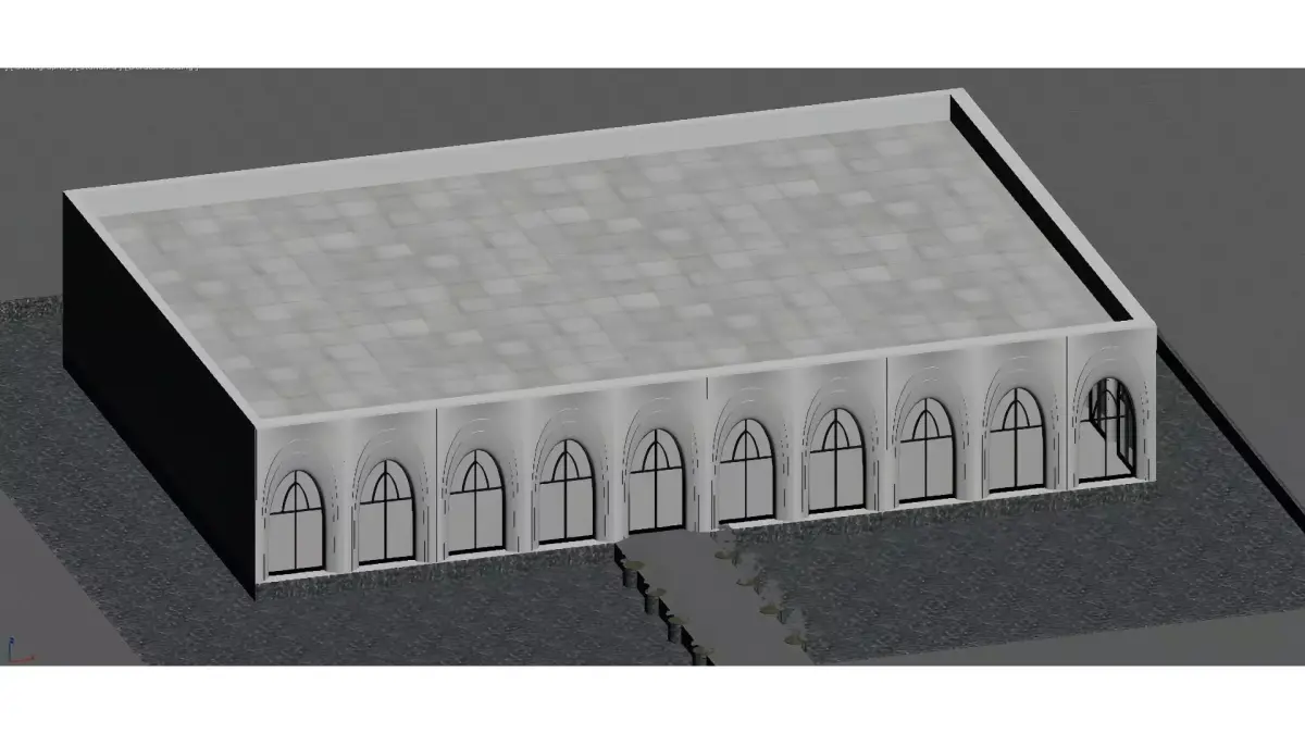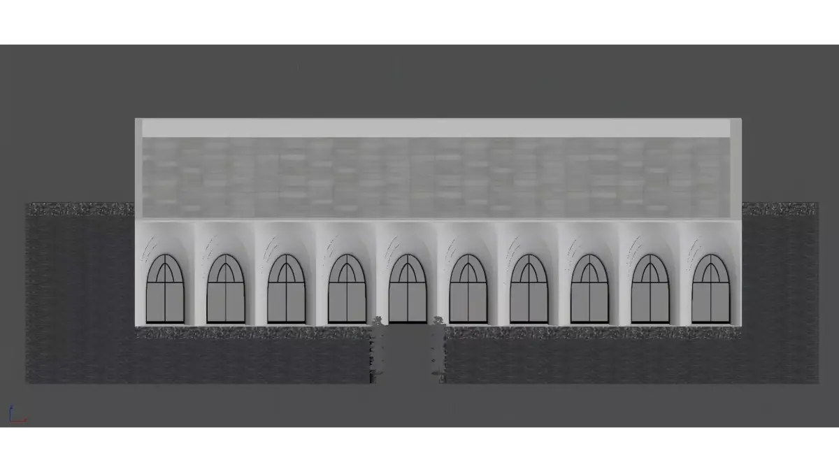 Based on a minimalist white building, it is paired with continuous arched doors and windows, combined with new Chinese-style potted plants (pine trees) and mirrored water features, creating a high-end courtyard space that blends wabi-sabi style with modern minimalism. The overall style is clean, transparent and elegantly textured.