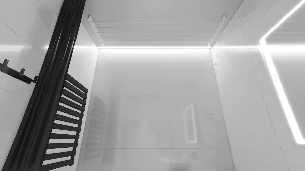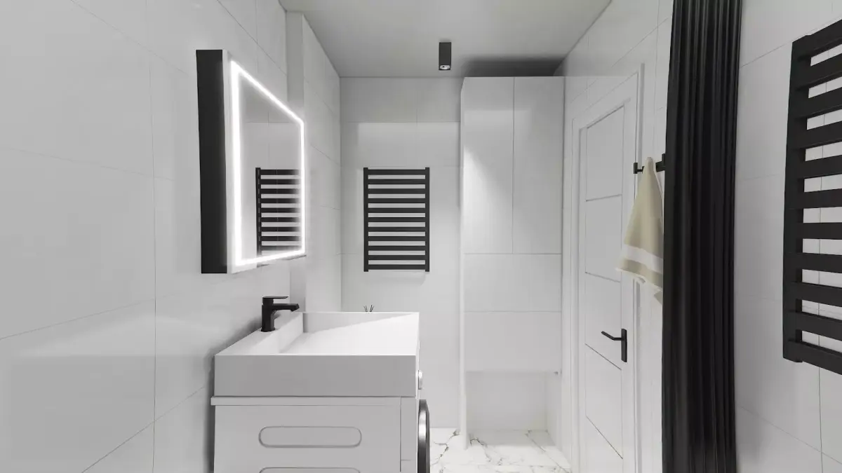 Lighting Scenario: A well-thought-out multi-level lighting scheme (hidden LED ceiling strip, backlit mirror) creates an atmosphere of cleanliness and volume.