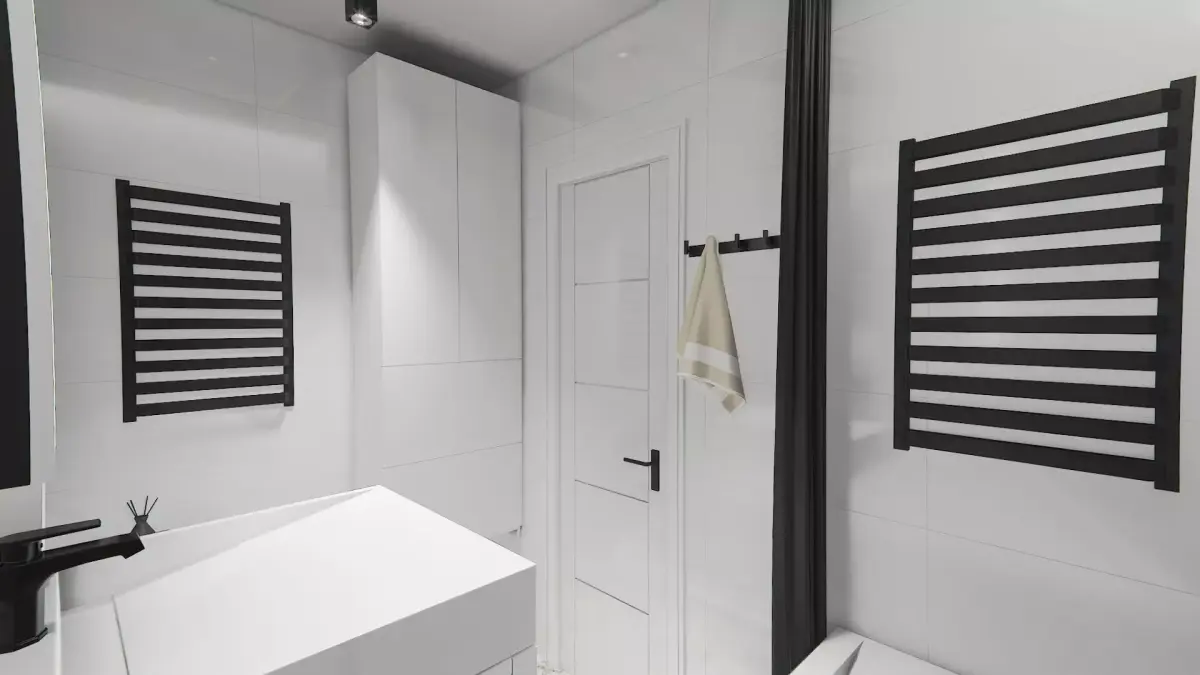 The design is based on a contrasting combination of glossy white wall tiles and matte black fixtures and accessories, accented by white marble with golden/brown veins (used on the bathtub panel and the floor). The scene is fully furnished and decorated, allowing you to achieve a high-quality result out of the box.