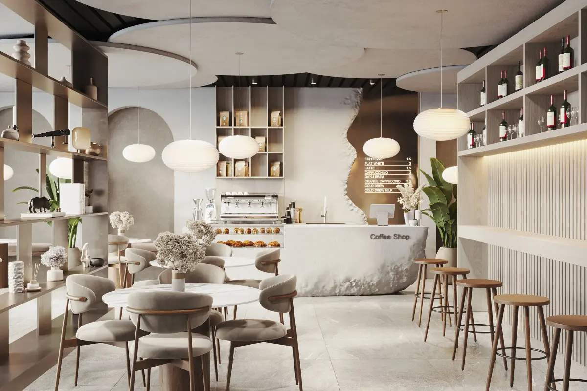 Step into a warm and inviting coffee shop interior, crafted with modern elegance and minimalist charm. This high-quality 3D model includes detailed furniture, lighting, decor, and bar setups, ready for use in commercial and architectural visualization.