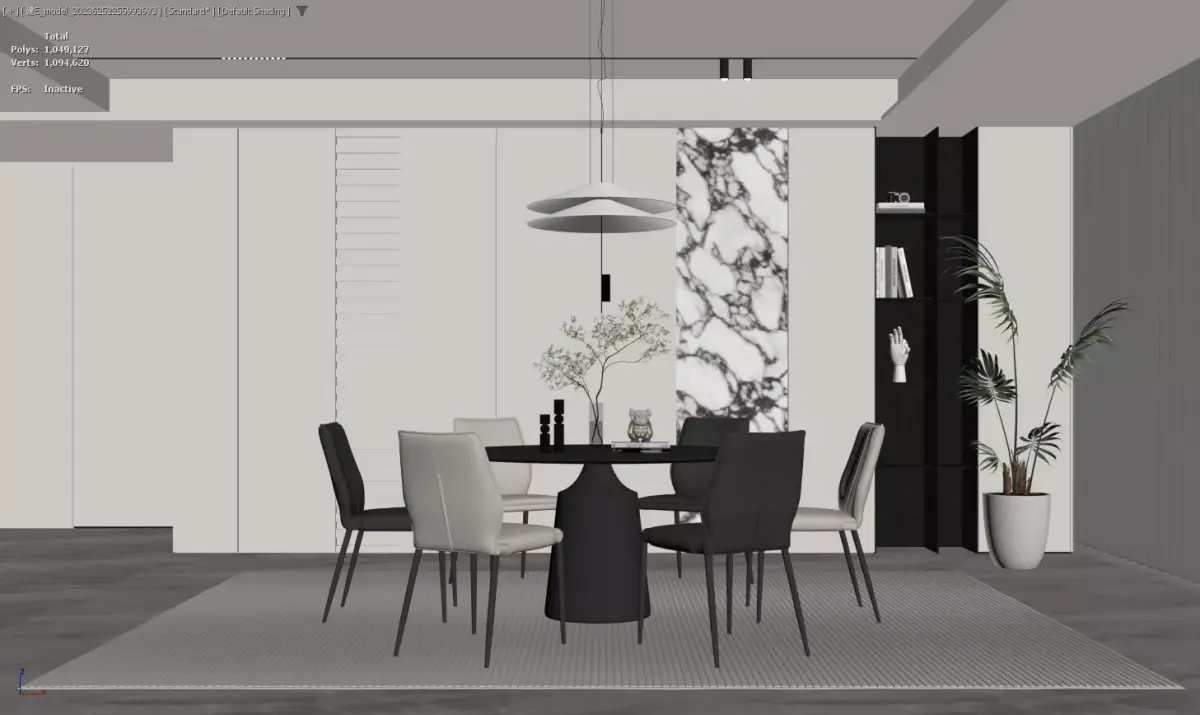 Modern minimalist dining room featuring a round dining table, mixed fabric chairs, a statement pendant light, marble accent wall, and built-in shelving. Ideal for contemporary home interior design, creating a sleek and elegant dining environment.