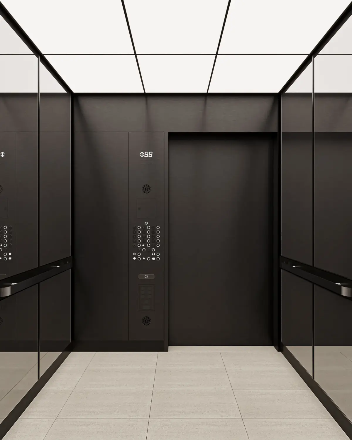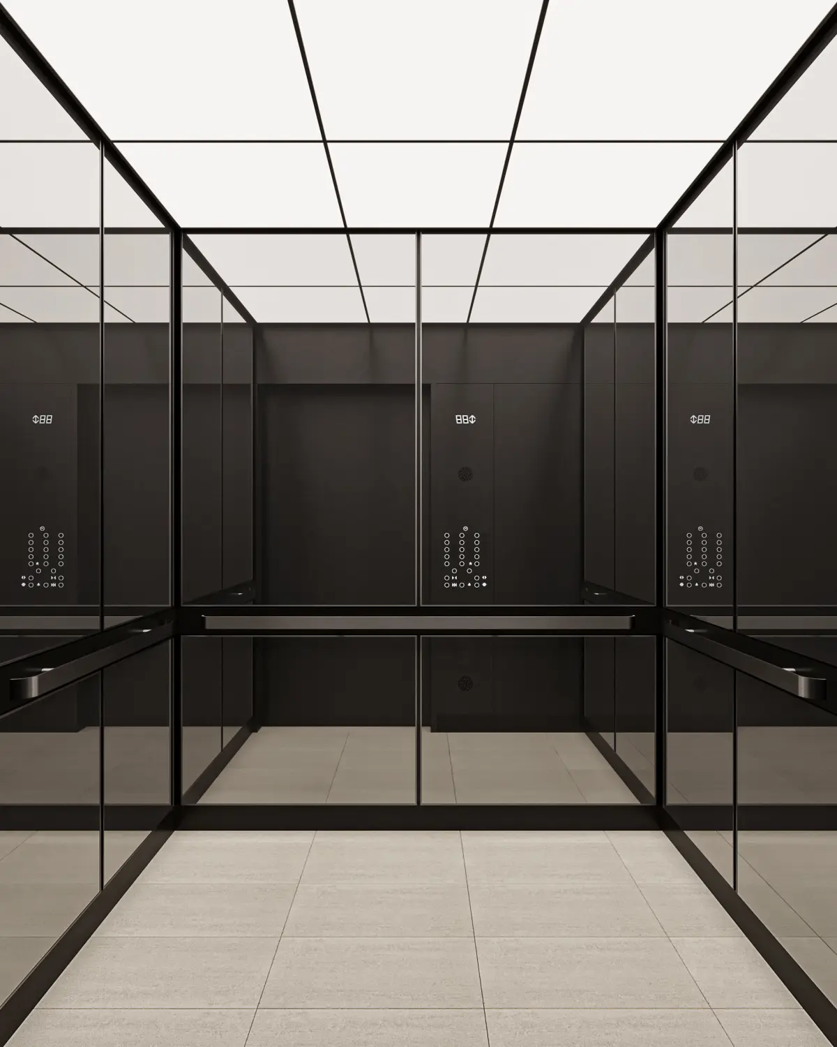 Interior View: A sleek elevator cabin with black panels, mirrored walls, stainless steel accents, and a soft-lit ceiling for an elegant, high-end aesthetic.Exterior View: A polished elevator bank showcasing three sleek, black elevator doors framed within a contemporary wall panel system.Rendered with Corona Renderer and modeled in 3ds Max, this asset is optimized for realistic results in various lighting scenarios. Perfect for use in luxury office buildings, hotels, or residential spaces.