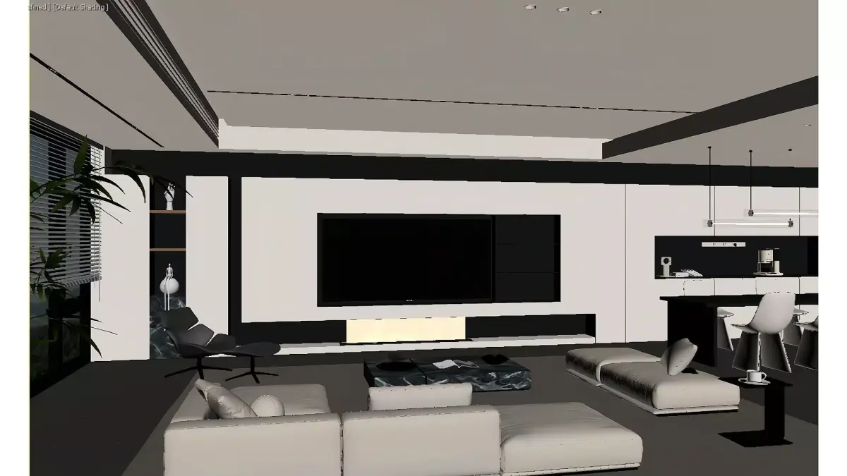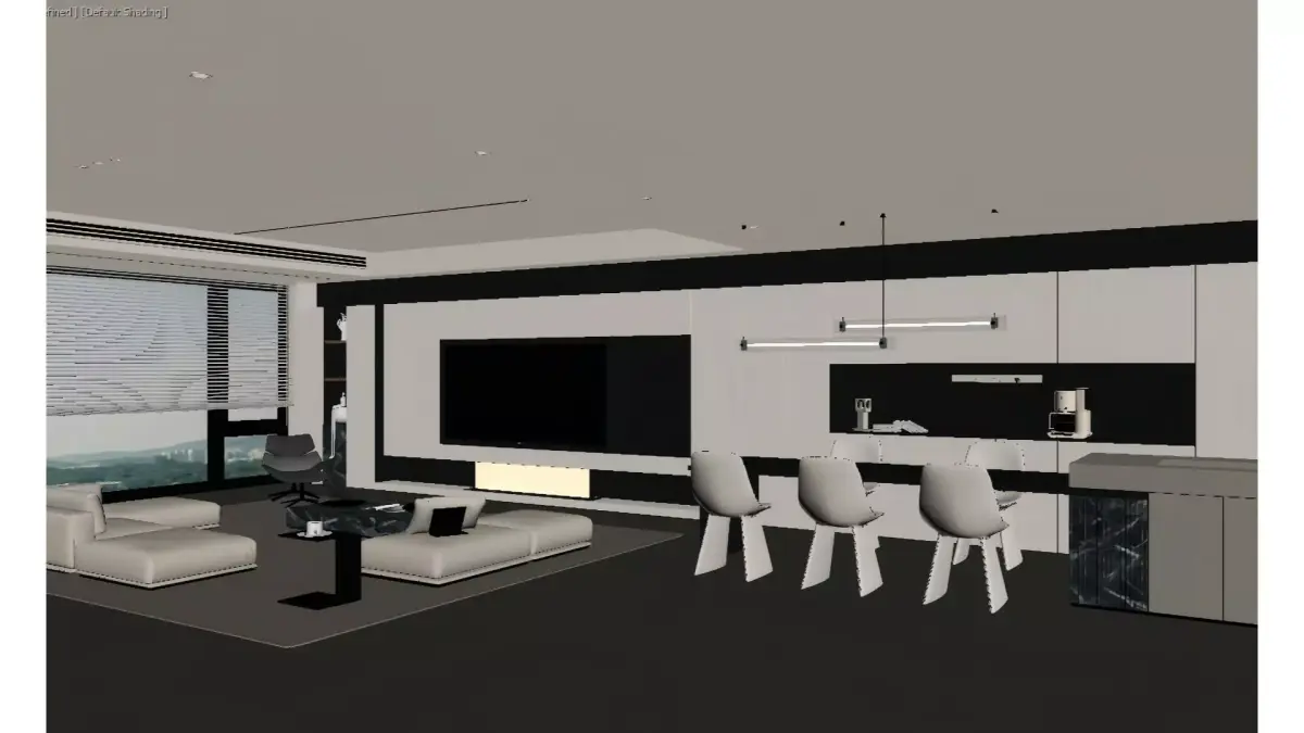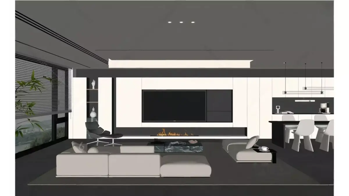 This is a modern minimalist integrated space combining the living room, dining room, and kitchen in a large flat. Dominated by a black, white, and gray color palette, it is complemented by cream-white soft furnishings to soften the cool tone. The living room features a main-light-free design with a floating ceiling; the floating TV cabinet incorporates a fireplace element, paired with a marble coffee table and a modular sofa, achieving both a high-end feel and a sense of relaxation. The open kitchen and dining area continues the minimalist style, with black and white countertops and geometric-shaped dining chairs. The entire space is transparent and neat, fully presenting a luxurious, comfortable urban home atmosphere.