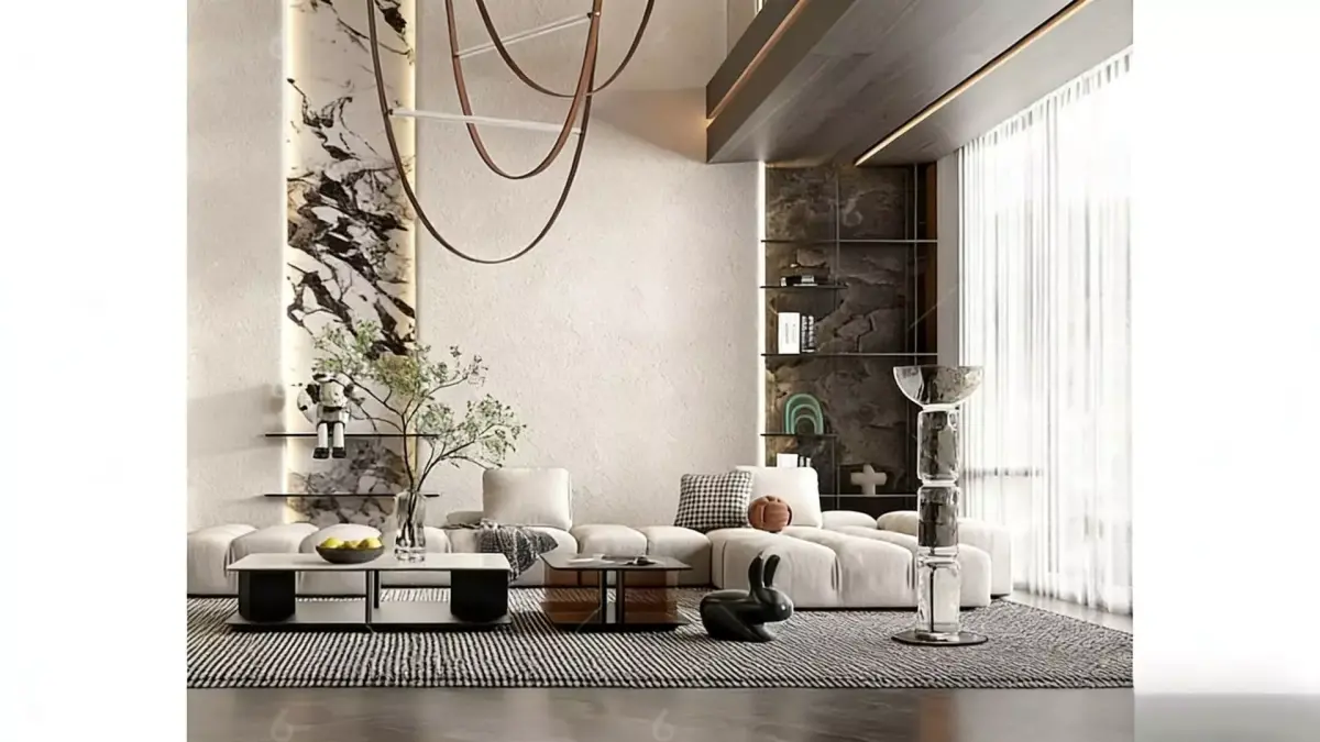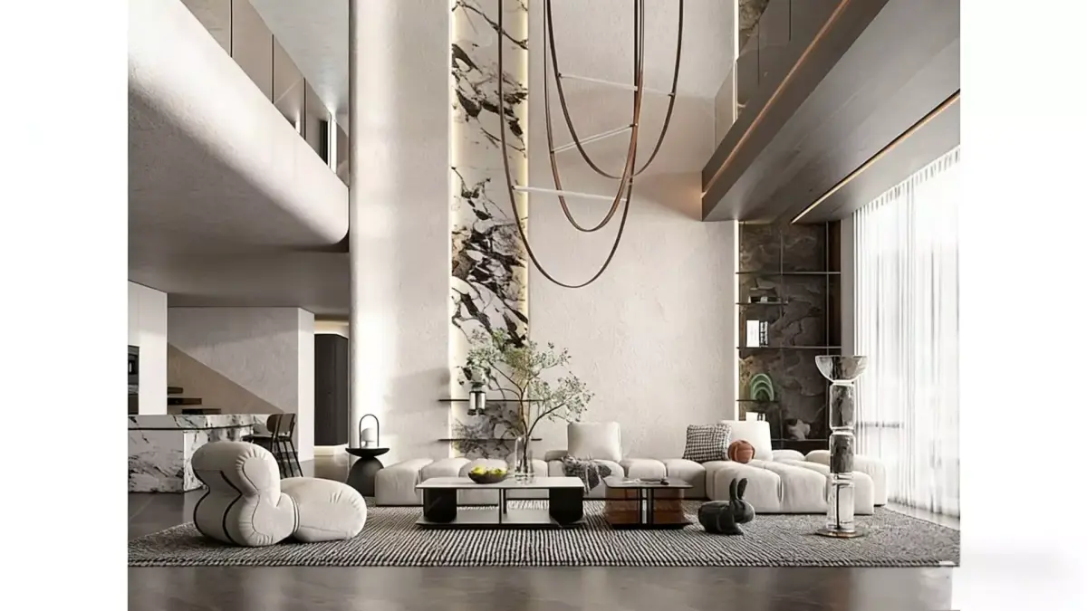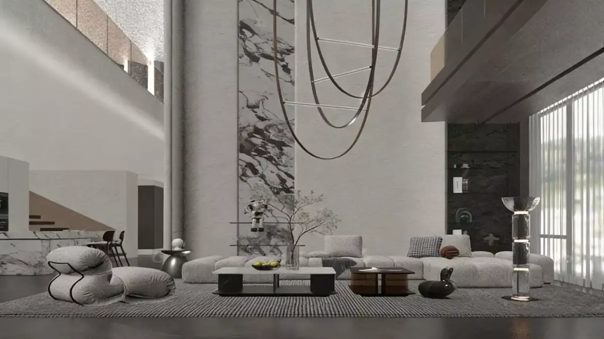 This is a double-height villa living room combining modern minimalism with light luxury style. Based on off-white and light gray tones, it creates a restrained yet high-end texture through the material collision of marble (wall/coffee table), metal (chandelier/decorative items), and fabric (irregular-shaped sofa). The double-height design paired with large floor-to-ceiling windows makes the space transparent and spacious; the circular metal chandelier and irregular sofa serve as visual focal points, while the black-and-white striped carpet and artistic decorations (rabbit sculpture, glass vase) add an exquisite atmosphere in the details. Overall, it retains the neat lines of minimalism and integrates the delicate texture of light luxury, making it a perfect home model for large-sized residences that emphasizes transparency + exquisiteness.
