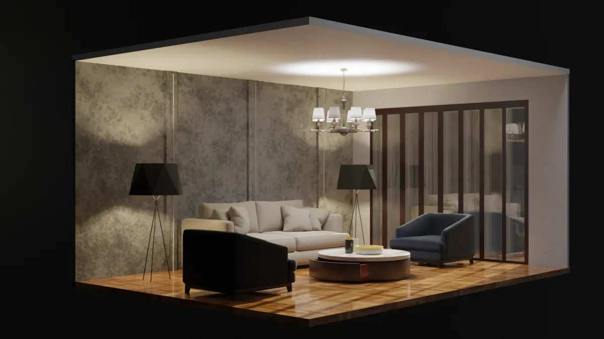 modern, minimalist living room interior. It features a beige sofa with matching cushions, two dark-colored armchairs, and a round wooden coffee table in the center. The floor is made of polished wood with a rich pattern, and the walls have a textured, concrete-like finish.