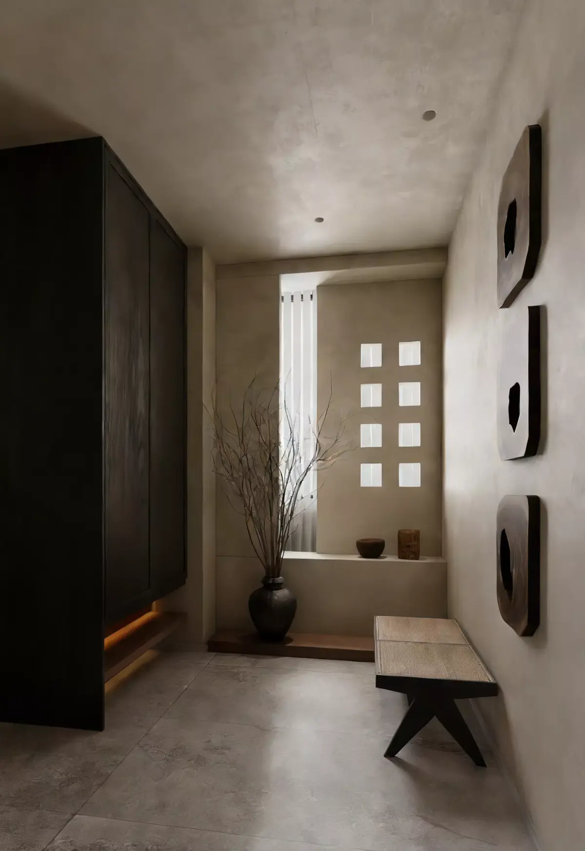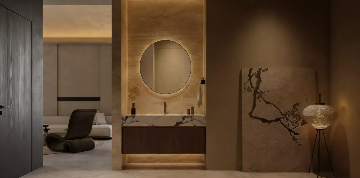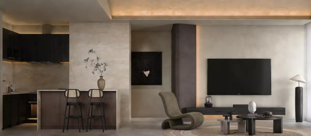 Modern minimalist living room, wabi-sabi style living and dining room, minimalist, without main light living and dining room