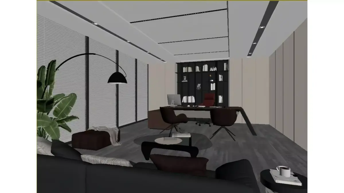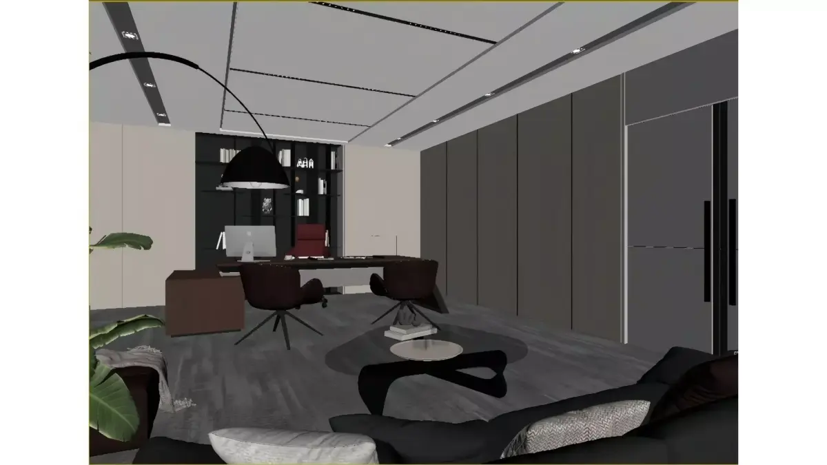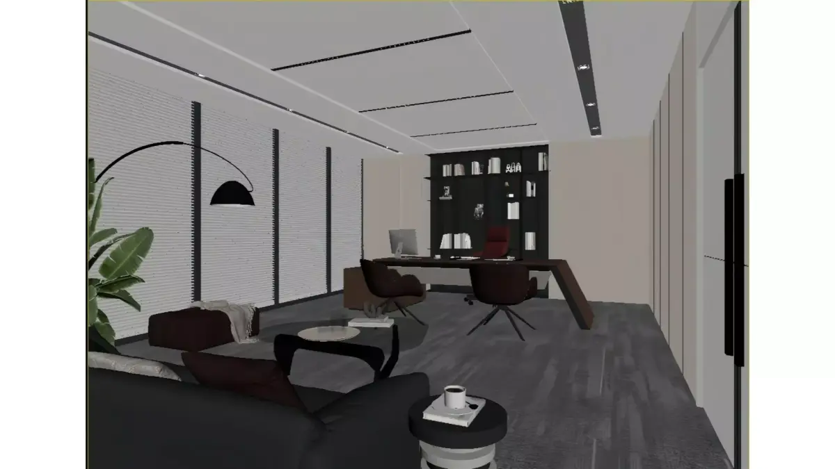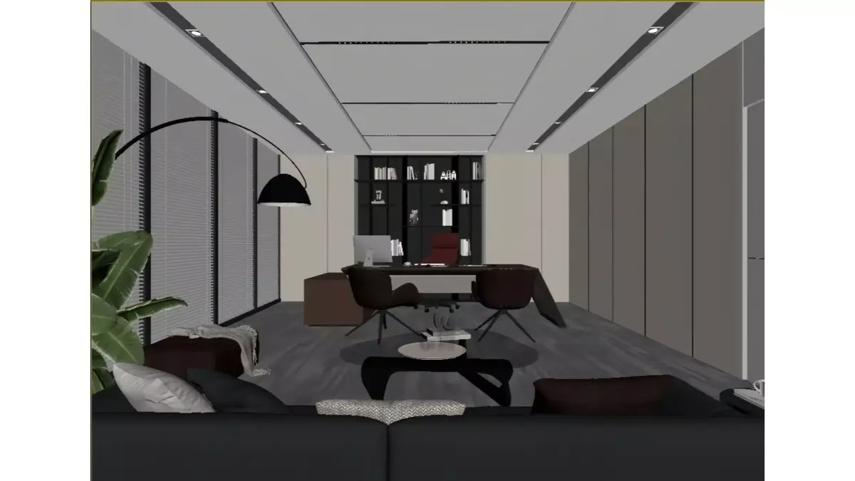 This is a modern light-luxury style CEO office centered on minimalist design. The space is mainly in gray-white and light brown tones, paired with dark brown leather furniture and red office chairs to create striking visual focal points.Floor-to-ceiling windows with venetian blinds ensure ample natural light, while recessed ceiling lights and curved floor lamps build layered lighting effects. The feature wall is fitted with a built-in bookshelf equipped with warm ambient lighting, which serves both storage purposes and aesthetic needs. A sofa lounge area is also incorporated into the layout, fulfilling office functions while embodying the comfort and sophistication of a high-end business space.