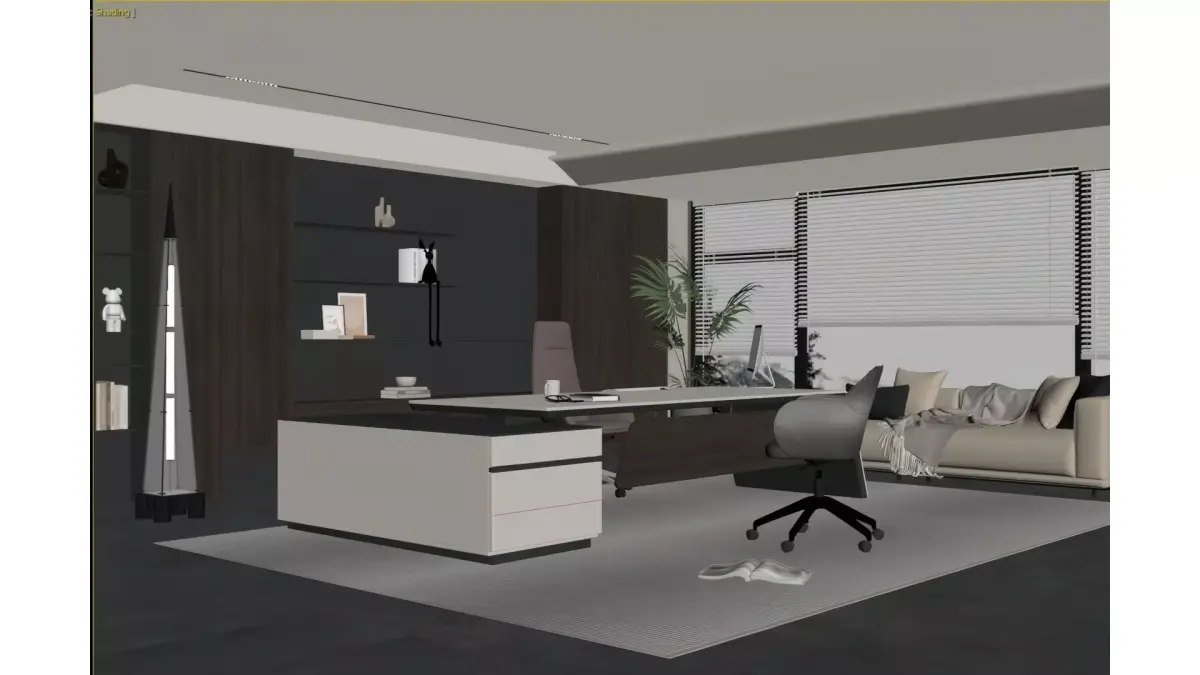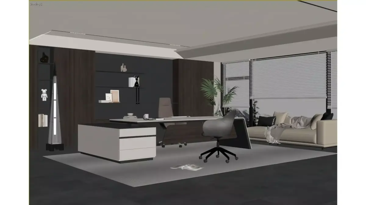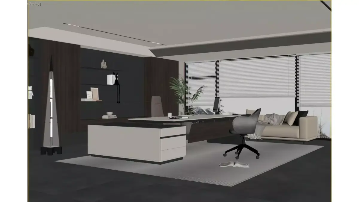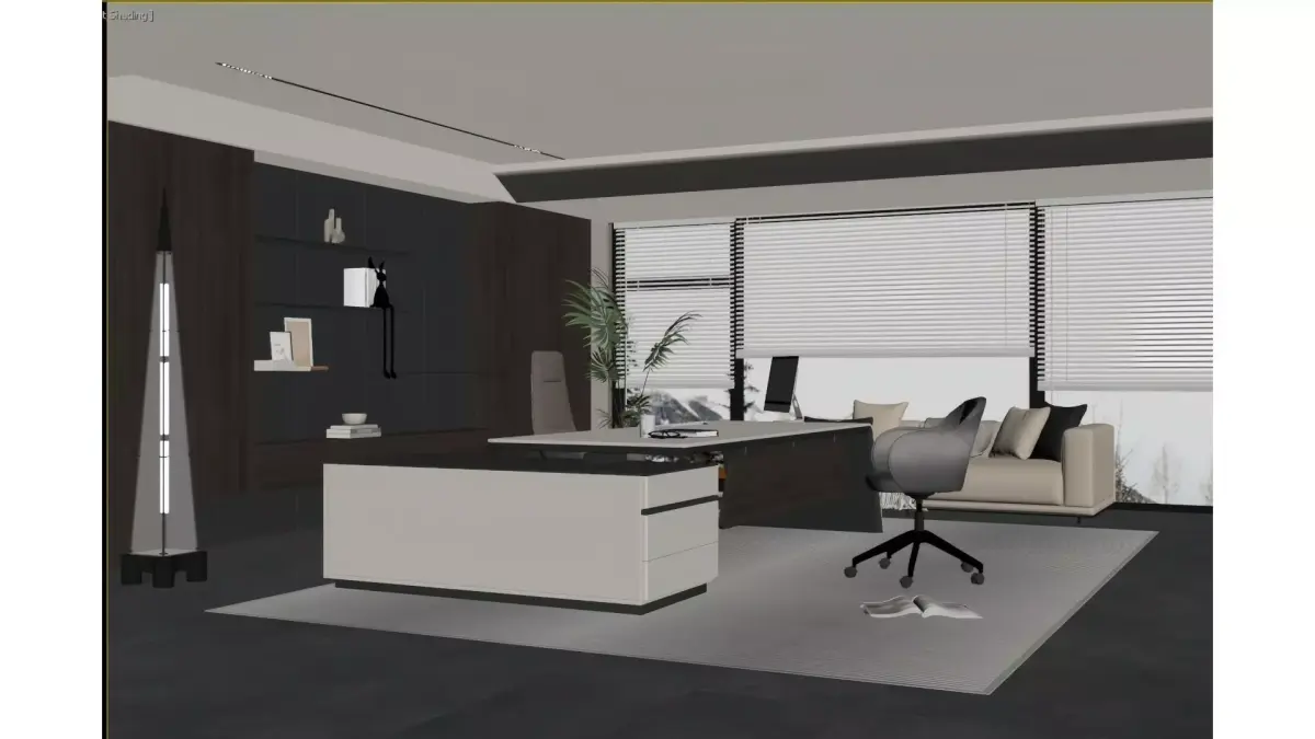 This is a modern light luxury-style CEO office, dominated by a black-white-gray color scheme and complemented by dark wooden cabinets and light beige soft furnishings, creating an elegant and composed business atmosphere.The space incorporates elements such as floating shelves (with built-in light strips), a minimalist desk, and comfortable lounge sofas. Large-scale shutters let in ample natural light, while smart lighting and green plant accents enhance the space's sophistication and relaxed vibe, striking a perfect balance between office efficiency and comfortable experience.