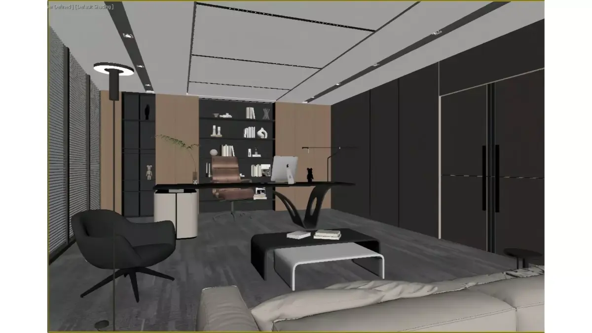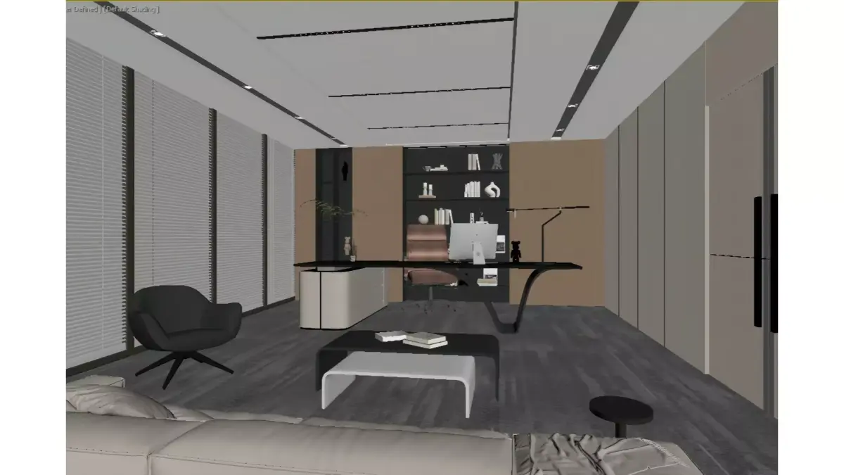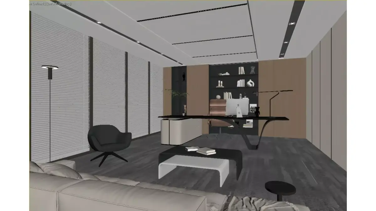 This is a modern minimalist-style chairman's office, featuring light wood tones and off-white as the main color palette. Combined with recessed lighting and floating bookshelves, it creates a light-luxury and high-end office atmosphere.The space integrates a working area and a lounge sofa area. Large floor-to-ceiling windows flood the interior with ample natural light, striking a perfect balance between a professional business vibe and a comfortable experience. It stands as a typical design example of a modern high-end office space.