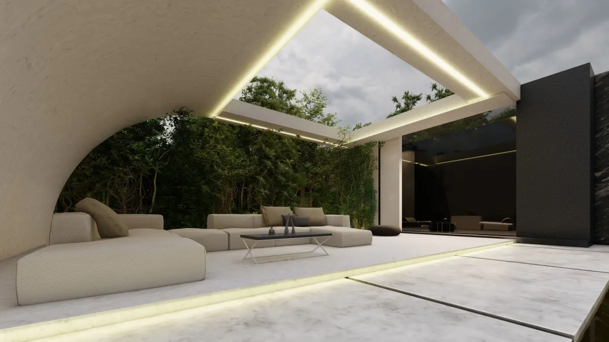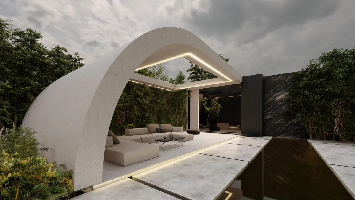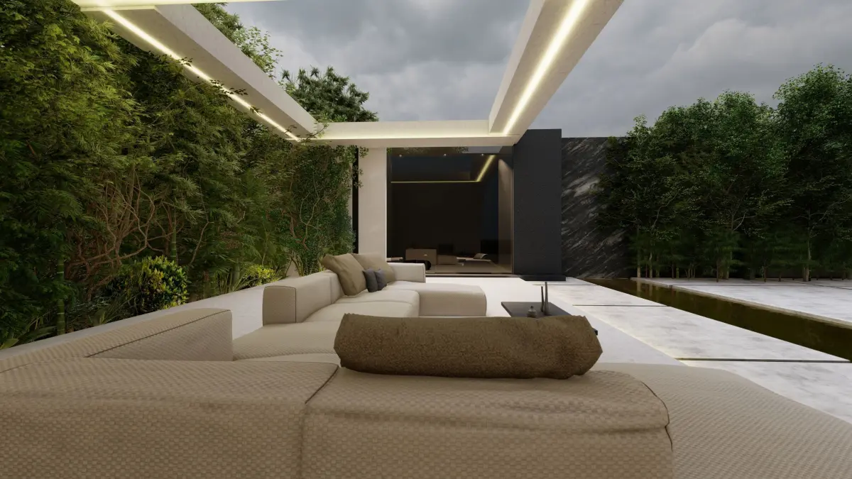Modern pergola structurePool with reflective waterLush greenery and landscapingComfortable outdoor furnitureAtmospheric lightingFile Formats:
