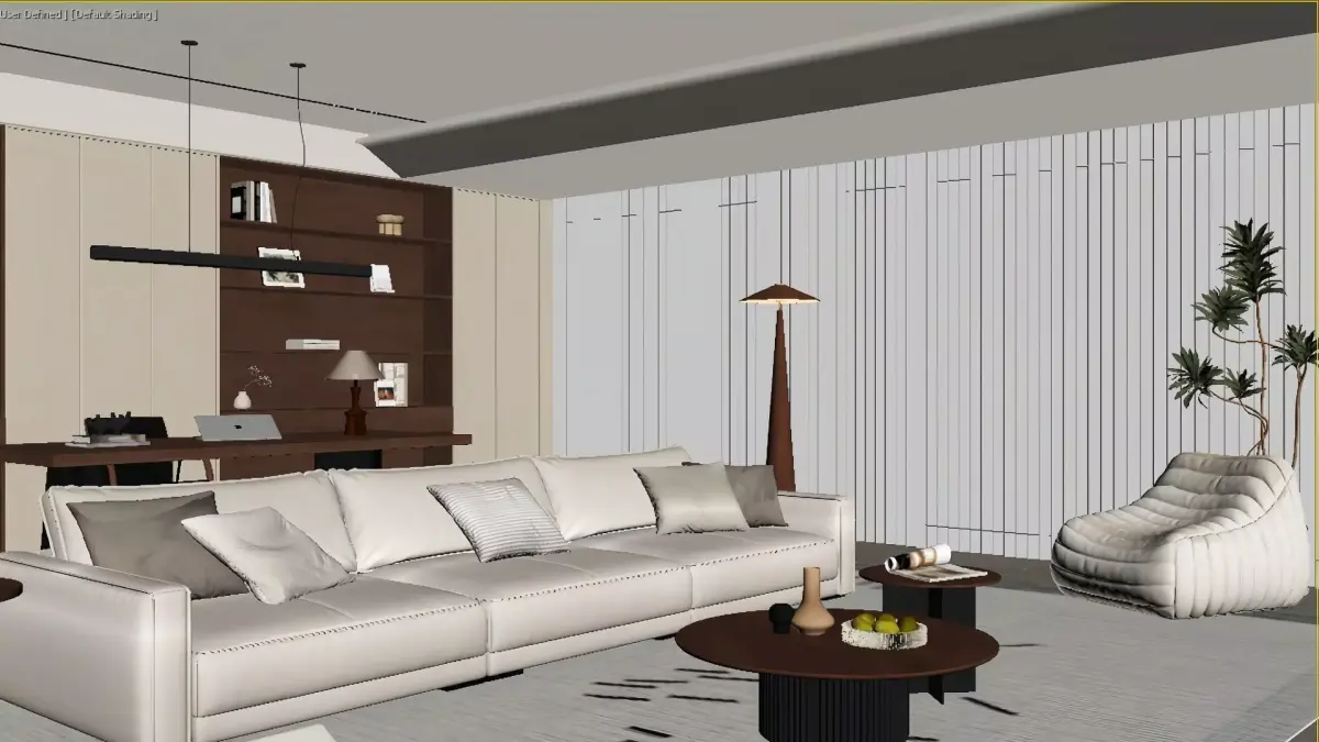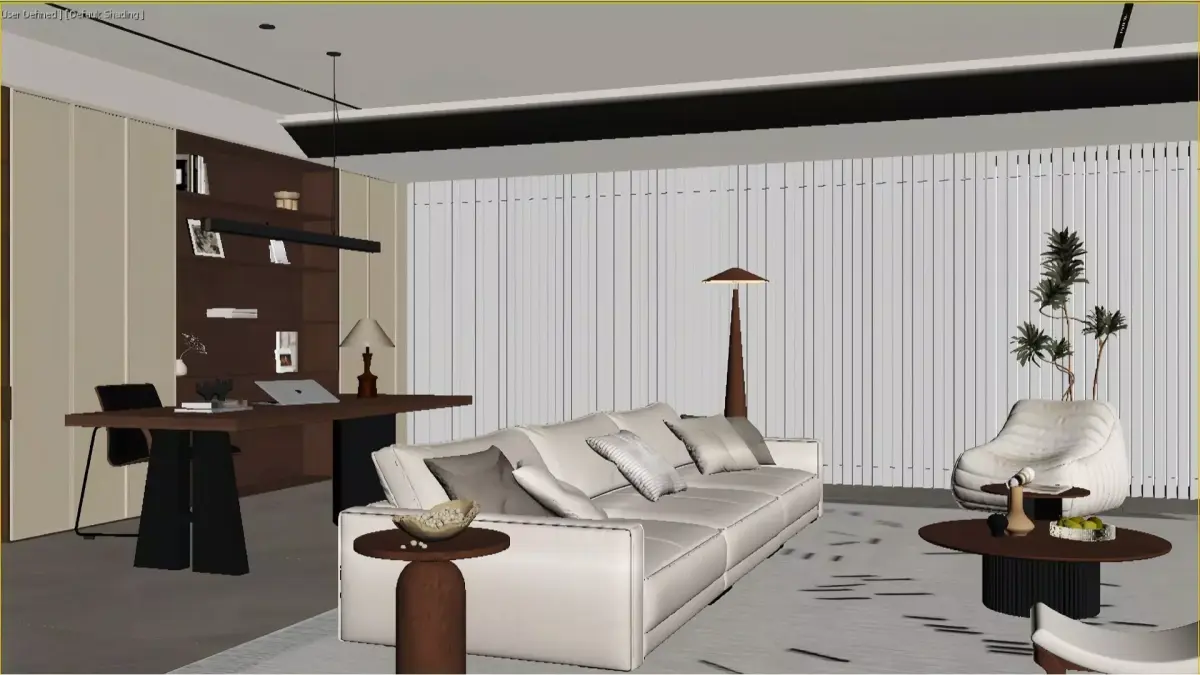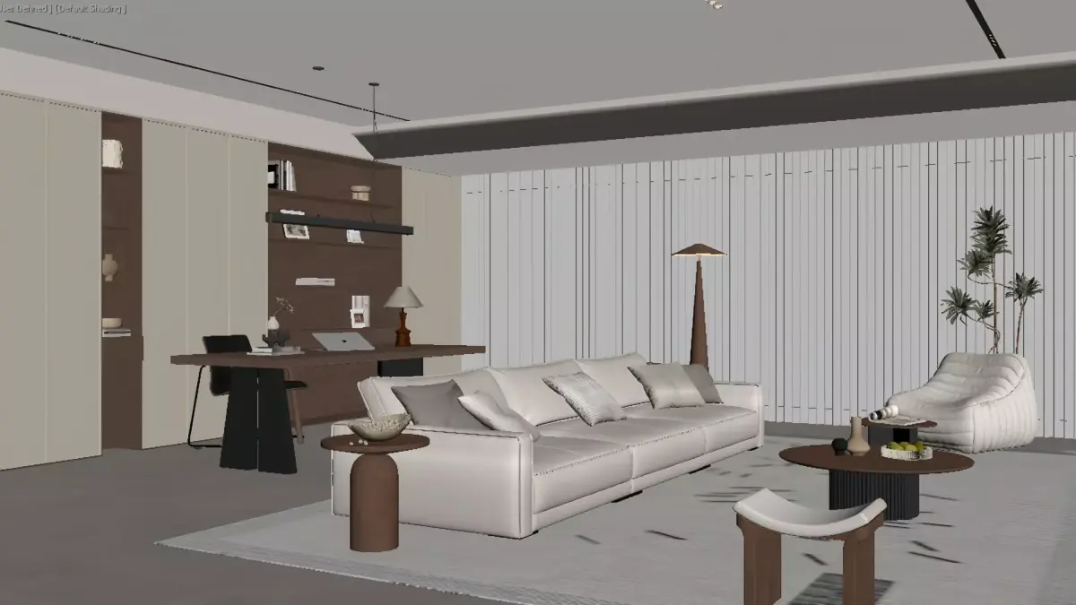 This is a modern minimalist large flat living room combining cream tones and solid wood elements. Adopting a no-main-light design (recessed lights + linear lights) to create a soft atmosphere, the open layout integrates the living area with the workspace. The light beige sofa and textured carpet are paired with wooden furniture, maintaining a minimalist texture while adding a sense of light luxury and warmth through warm light shelves and artistic decorations. The overall space is bright, transparent and comfortable, embodying the popular light minimalism with subtle luxury home style.