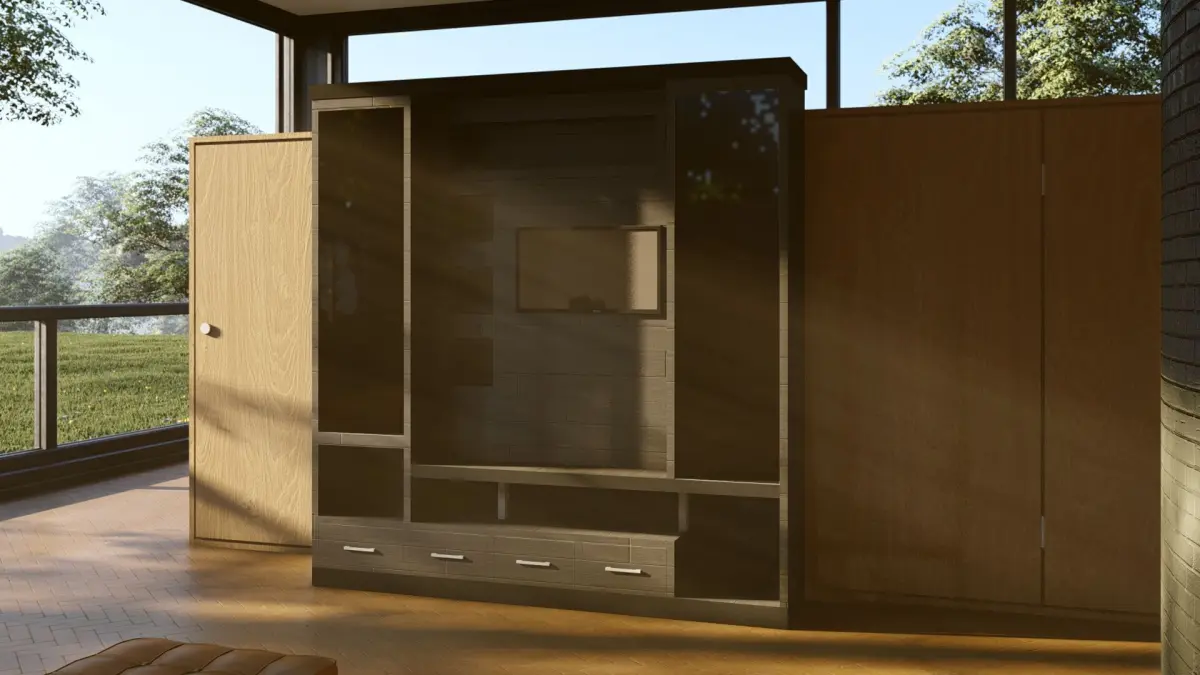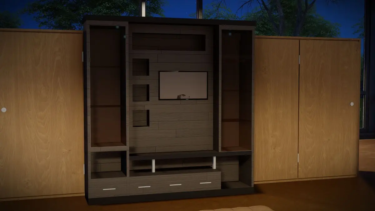 Modern TV Wall Unit with Storage and Display: This 3D model features a modern TV wall unit with storage and display. The TV wall unit features a floating shelf, drawers, and cabinets, providing ample storage space for your electronics and media. The integrated lighting adds a touch of elegance and helps to create a warm and inviting atmosphere. This model is perfect for anyone who wants a stylish and practical TV wall.