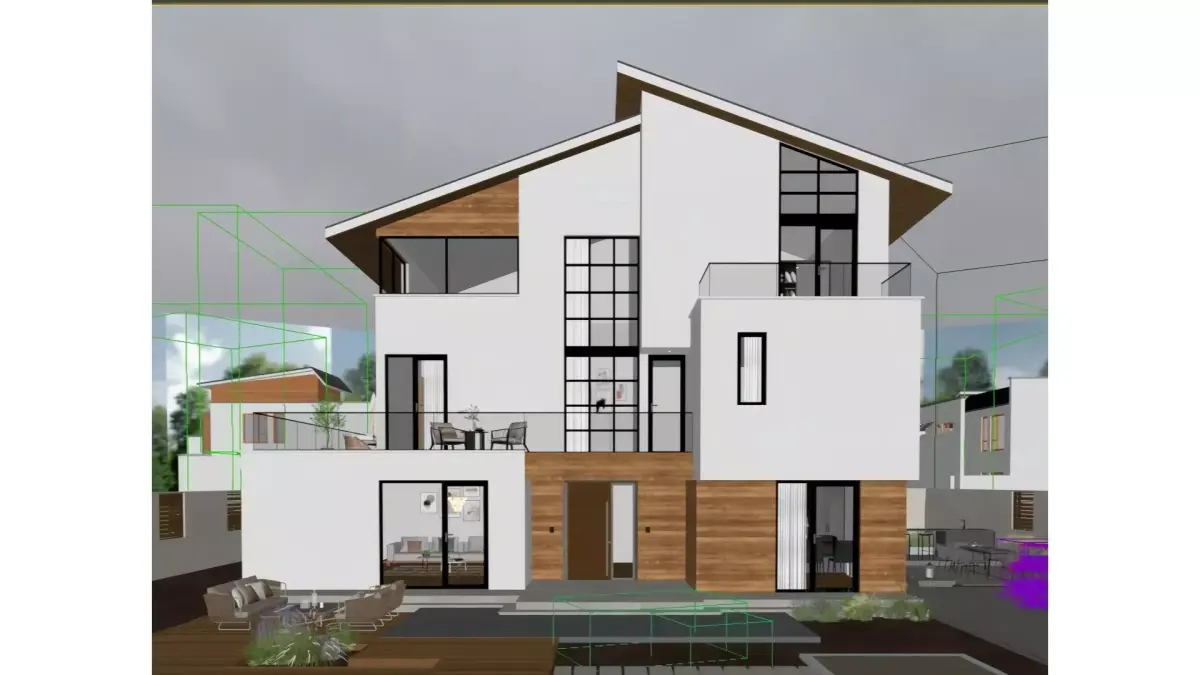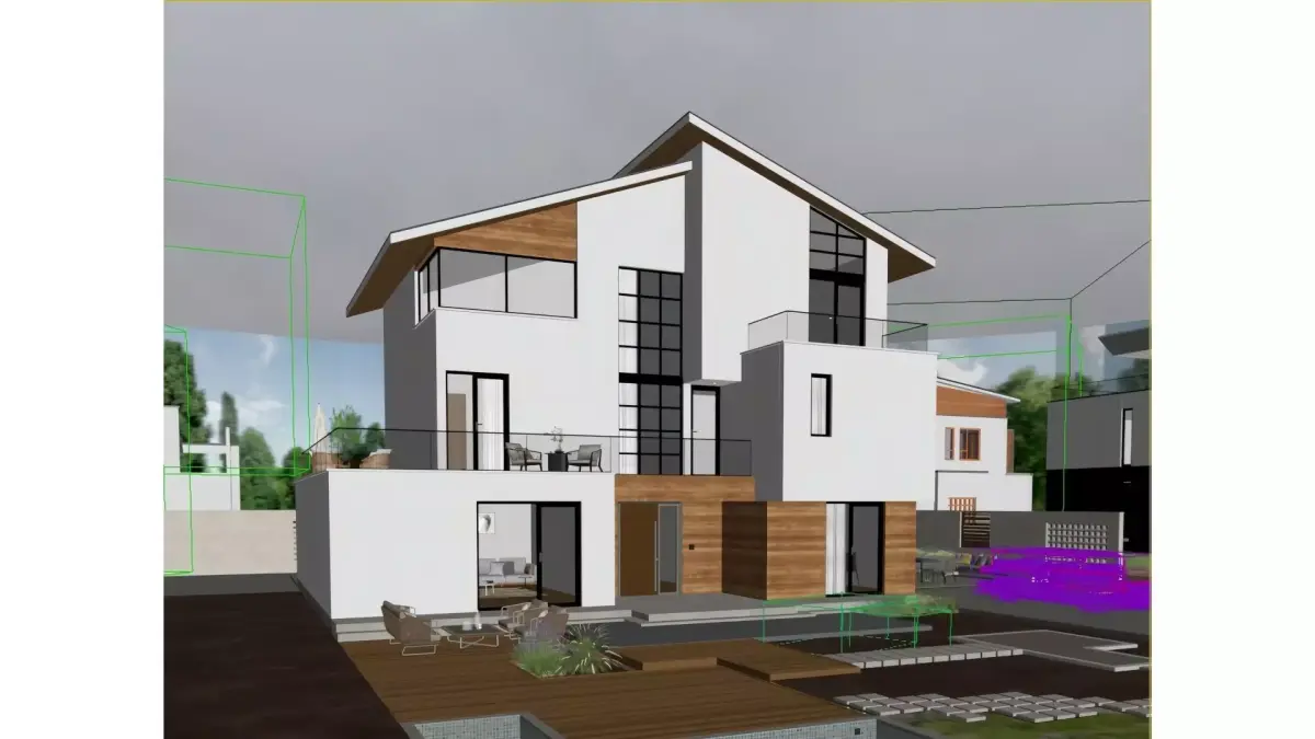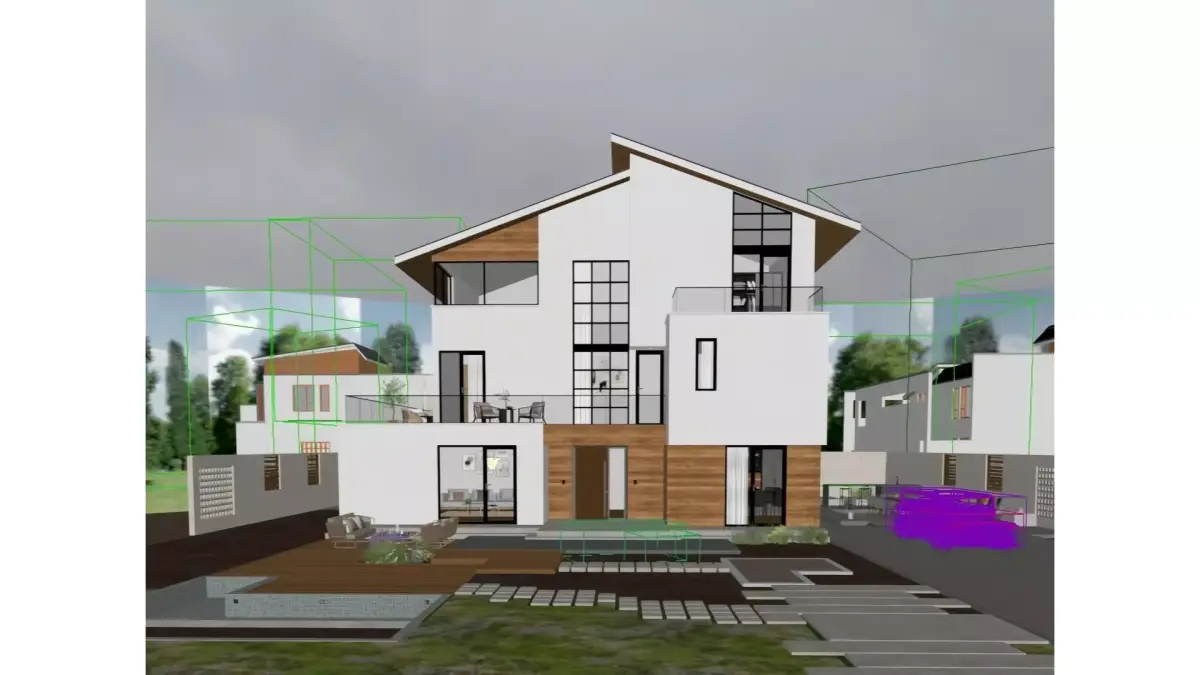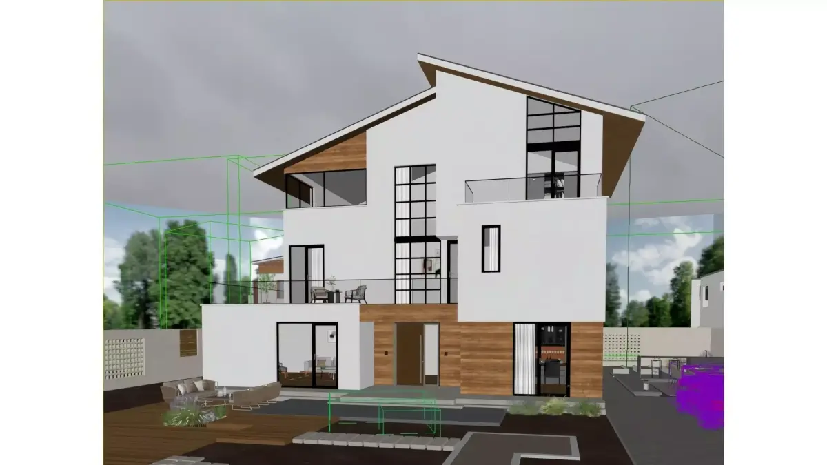 This is a three - story detached villa in a modern minimalist style. Dominated by a white color scheme, it is paired with natural wood veneers to create a soft texture. The facade adopts large - size glass doors and windows, achieving transparent lighting and a visual connection between the interior and exterior. The first floor is equipped with a courtyard leisure area (including a wooden platform and green plant landscapes), while the second and third floors have viewing terraces. Overall, it combines light luxury aesthetics with residential practicality, making it a high - end residential design that boasts both appealing appearance and comfortable living experience.