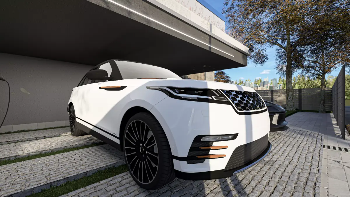 Realistic Design: Includes living room, modern kitchen, poolside terrace, and carport with vehicles.