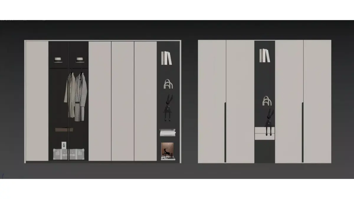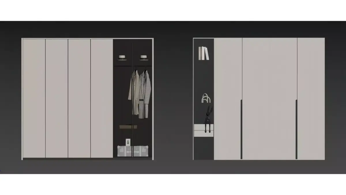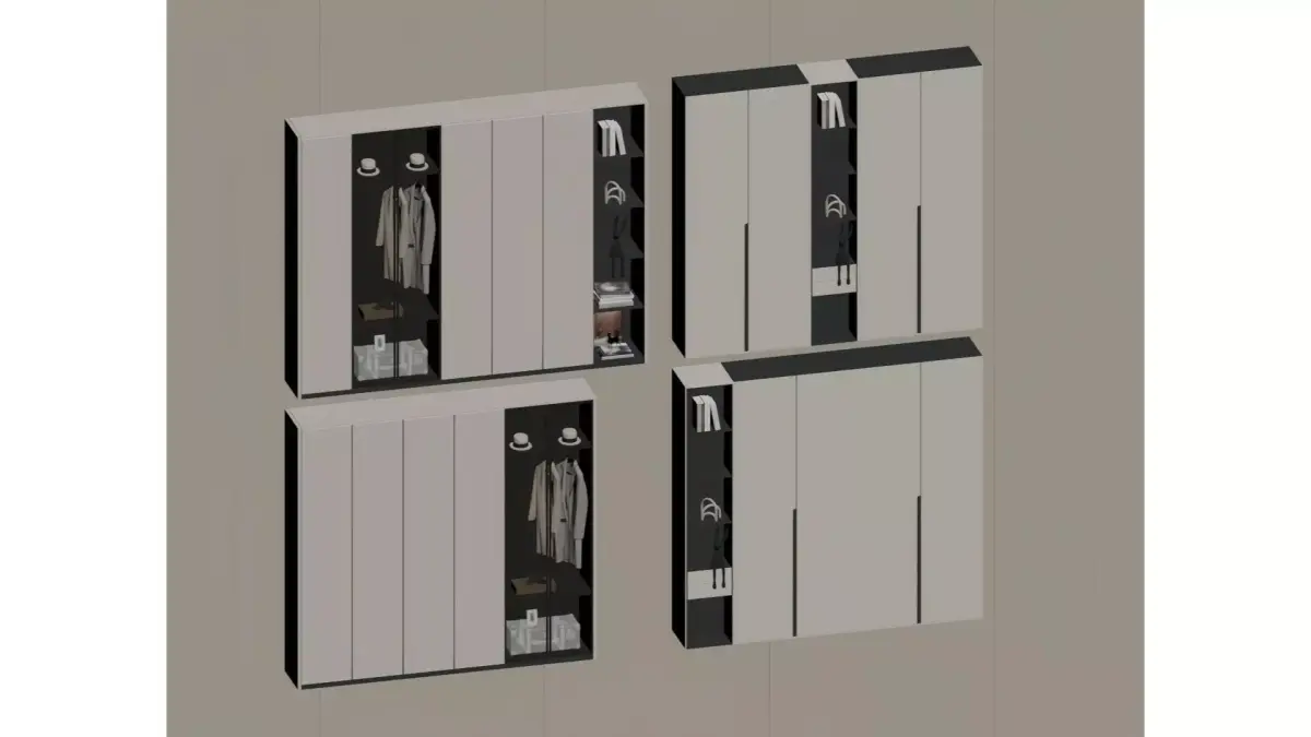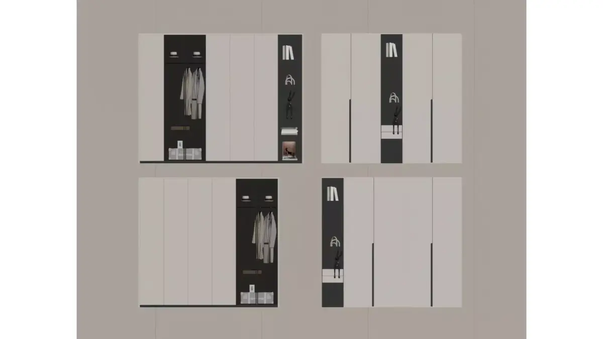 This is a set of modern minimalist hanging wardrobes, featuring a light gray as the main color scheme. It is paired with ultra-minimalist matte cabinet doors and decorated with thin black lines, incorporating glass-door display sections and compartmentalized storage grids. The design strikes a perfect balance between light luxury texture and practical storage functionality.Supporting both built-in and wall-mounted installation methods, these wardrobes are ideal for minimalist and light luxury home spaces. They allow flexible compartmentalization for storing clothes, shoes, bags, and miscellaneous items, achieving a neat visual effect and high space utilization rate.