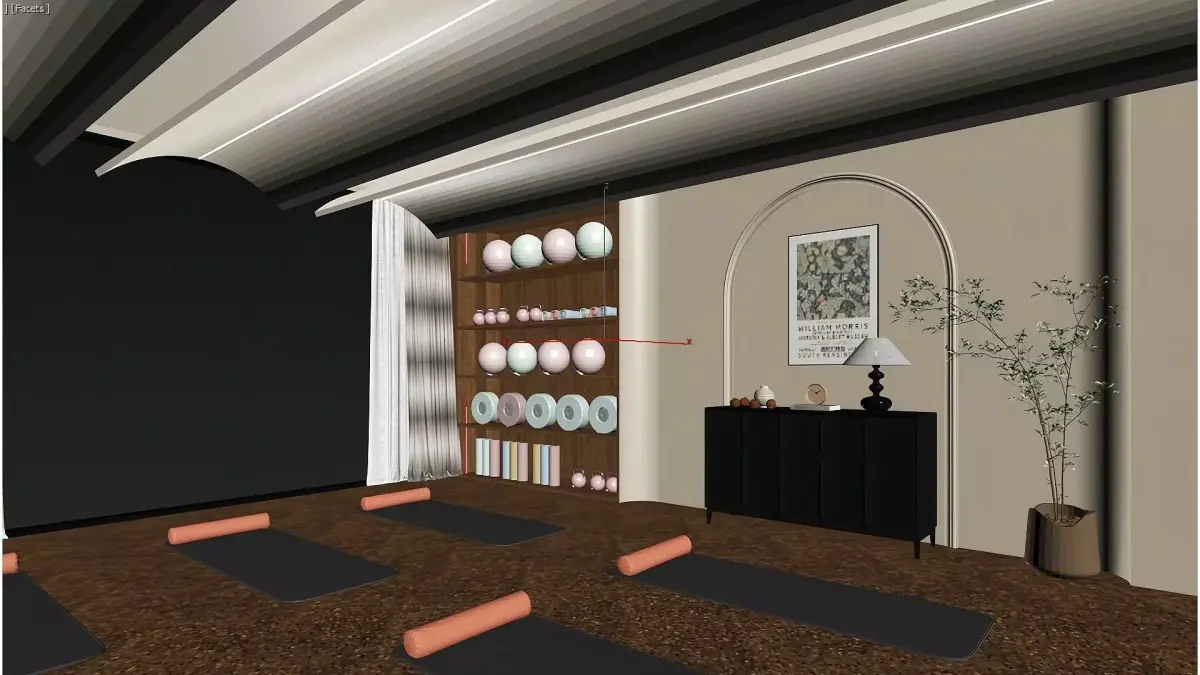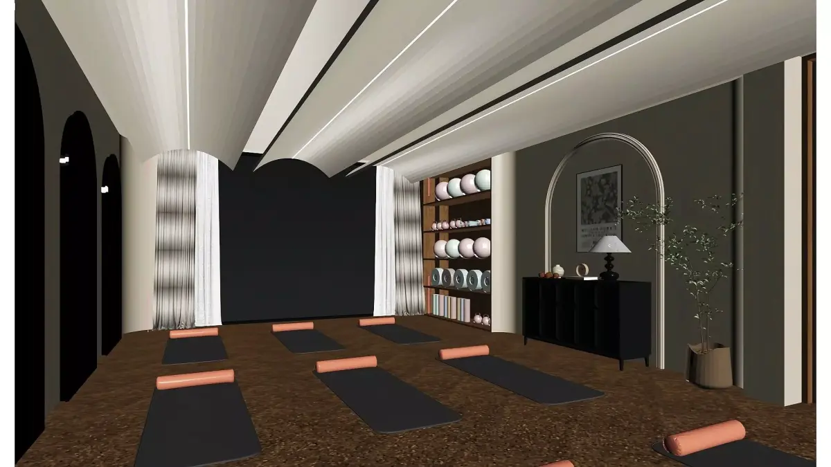 This is a modern yoga studio that combines arch elements with a light luxury texture: light-colored walls are paired with warm ambient lights, while arched doorways and full-panoramic floor-to-ceiling windows bring in natural light, with a broad landscape of mountains and waters visible outside the windows; the floor uses herringbone-patterned wooden planks, matched with gray yoga mats and orange auxiliary props. On one side, a cabinet displays yoga supplies. The entire space combines a healing vibe with practicality, making it suitable for yoga practice that soothes both the body and mind.