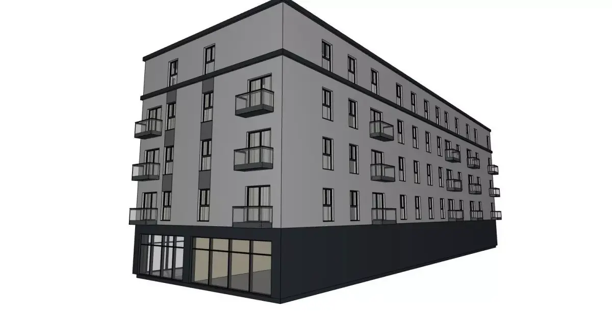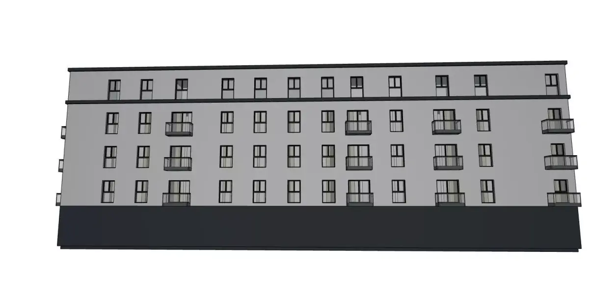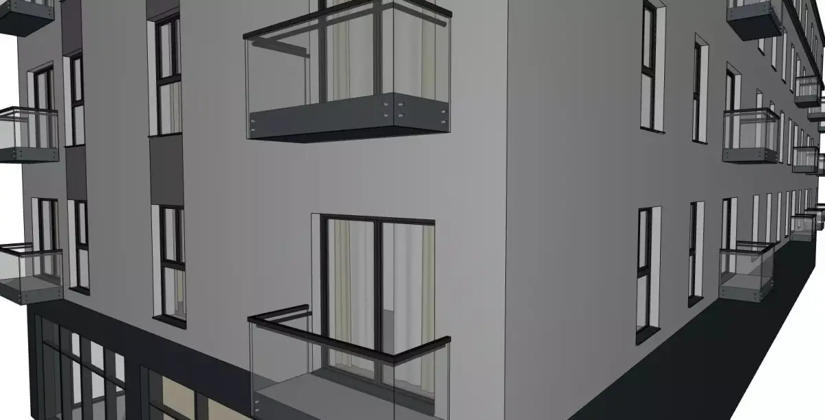 Model includes: building bodyshopfront glazing balconies window frame modules façade detail strips