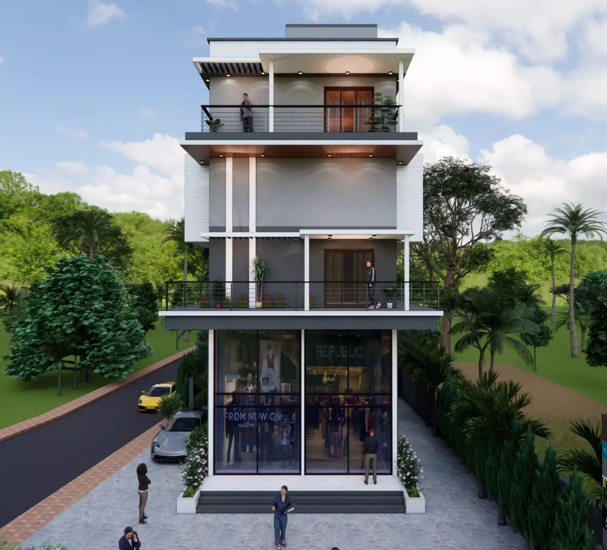 This is a modern mixed-use building 3D model designed for commercial use at the ground level and residential units on the upper floors.