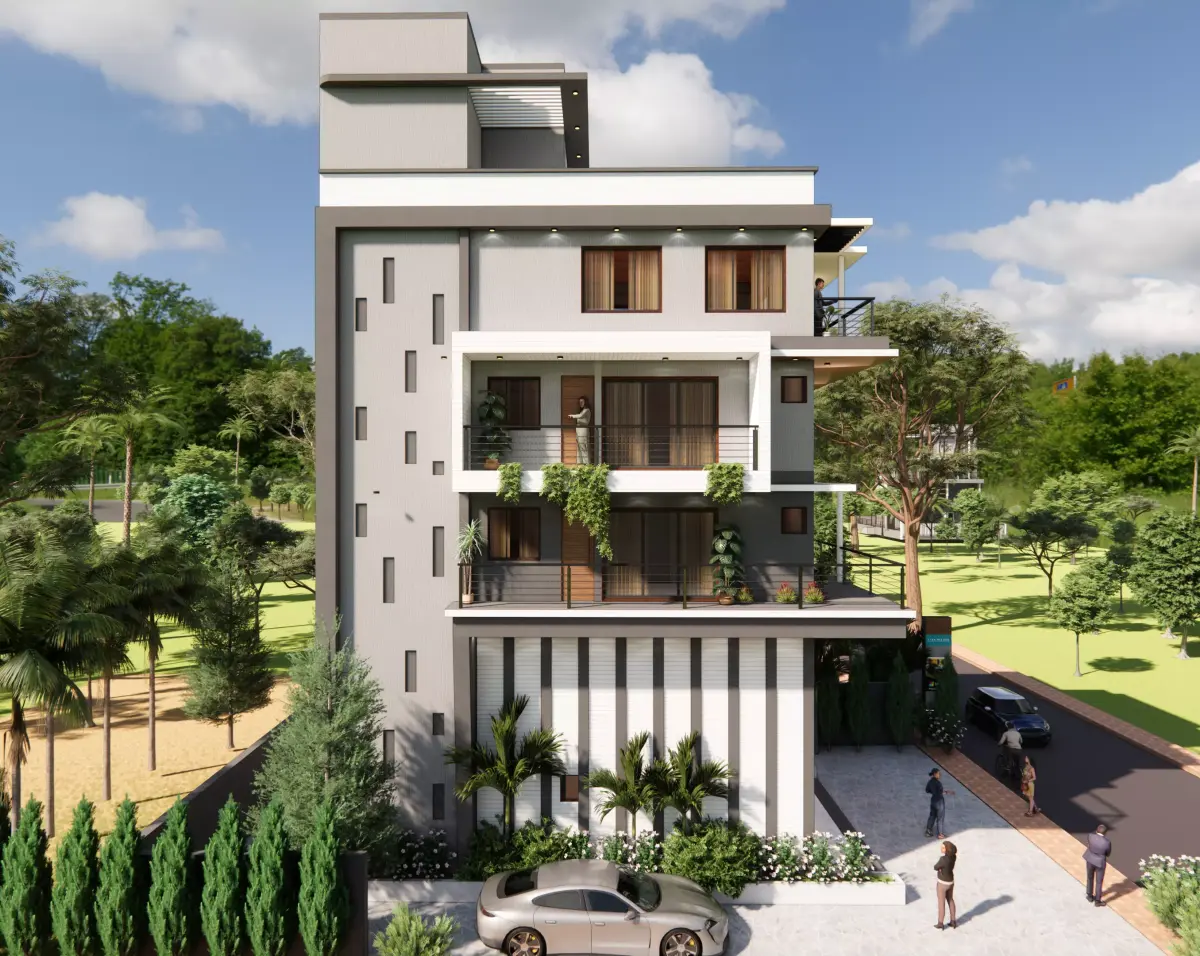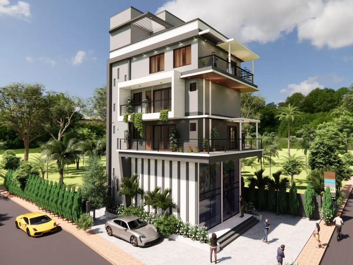 The architecture follows a contemporary urban design language, featuring clean geometry, layered balconies, large glazing, and a strong vertical composition, making it ideal for city developments and real-estate visualization.