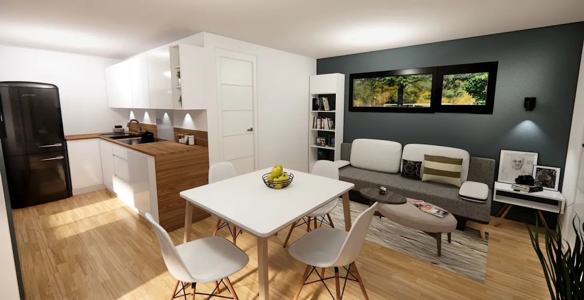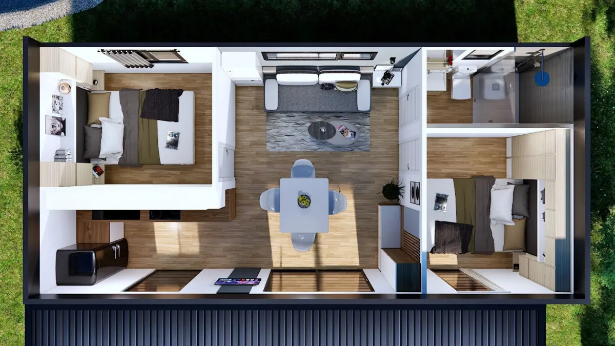 Modern designed MOBILE HOME, vacation house, tiny house... Modern designed home, tiny house, vacation house with a fully furnished interior, terrace... can be produced in Slovenija by my company and can be ordered and placed any where in europe.Or you can build it yourselve. Unique designed,modern,highly detailed 3D model with lot of useful 3D models and furniture in it. Model contains house with all the furniture in ,living room/bedroom,bathroom and terrace .