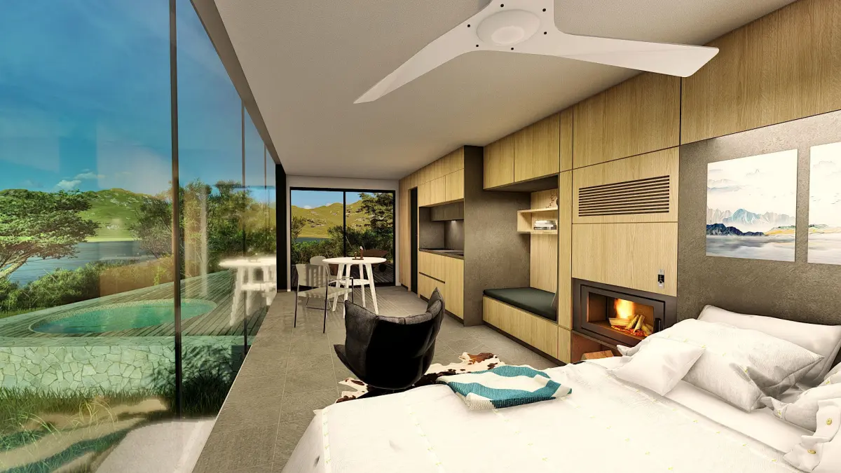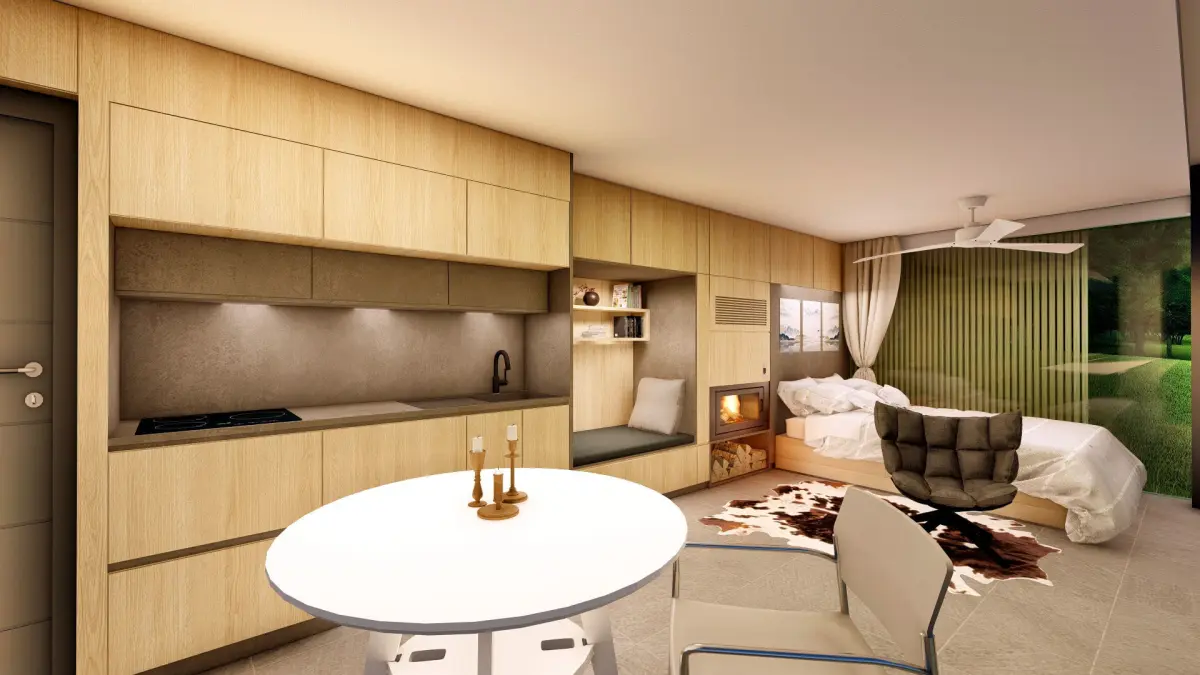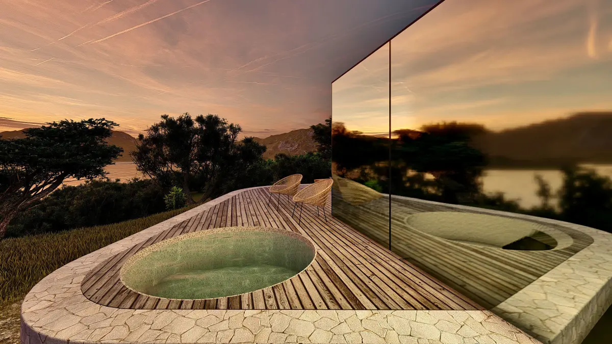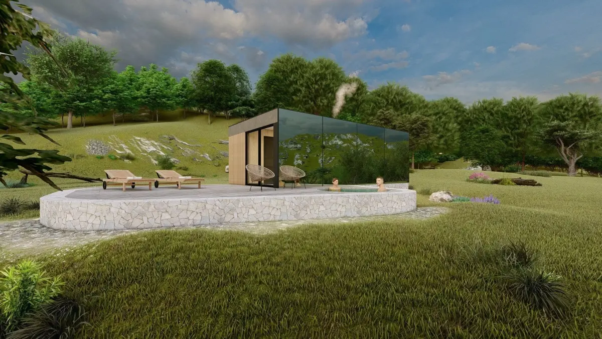 Modern , completely finished ,fully furnished interior , glamping unit/ mobile home/vacation house/tiny house with fireplace ant hot tube on terrace.FRont Facade is from reflective , 1 way see trough glass, that mirror on outside. Modern designed mobile house on 40 m2 with terrace 18m2,toilet/shower, kitchen /living room/bedroom... Unique designed,highly detailed model with lot of useful 3D models and furniture in it and table on terrace..Model contains house with all the furniture in ,living room,kitchen , bed, and terrace.Different facade variables are possible ,from stone,PVC or wood planks. Also feature a custom design kitchen . On the front of the glamping unit ,there is nice terrace with yackuzy .Kitchen is actually designed for a known customer and contains ,induction plate ,,sink,faucet... Suitable for sea site area as for the mountain areas asa for any turistic destinations. Model is done with sketch up 2019 pro and rendered with lumion. BEST TO USE WITH SKETCHUP!. 3DS Max and Cinema 4d users can import sketchup 2008 file format or fbx or obj. All textures appliances and furniture equipment is in high resolution,have been checked and are included in scene.Textures are compresed in zip file.Model is easy to manipulate and ready to render with v-ray. Real world scale and exact proportions cm. Realistic and correctly scaled ! • Excellent polygon & texture efficiency Purchasing this model , you get files in different formats as :skp, or ask designer for different formats. Additional Textures provided with the model: