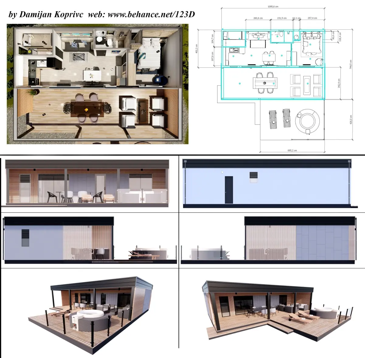 Modern designed mobile home, tiny house, vacation house on 44m2, with hot tube and terrace. Modern designed home, tiny house, vacation house with fully furnished interior, terrace...11m x 4m.It can be produced , Or you can build it yourselve. Unique designed,modern,highly detailed 3D model with lot of useful 3D models and furniture in it. Model contains house with all the furniture in , living room/bedroom,bathroom and terrace.
