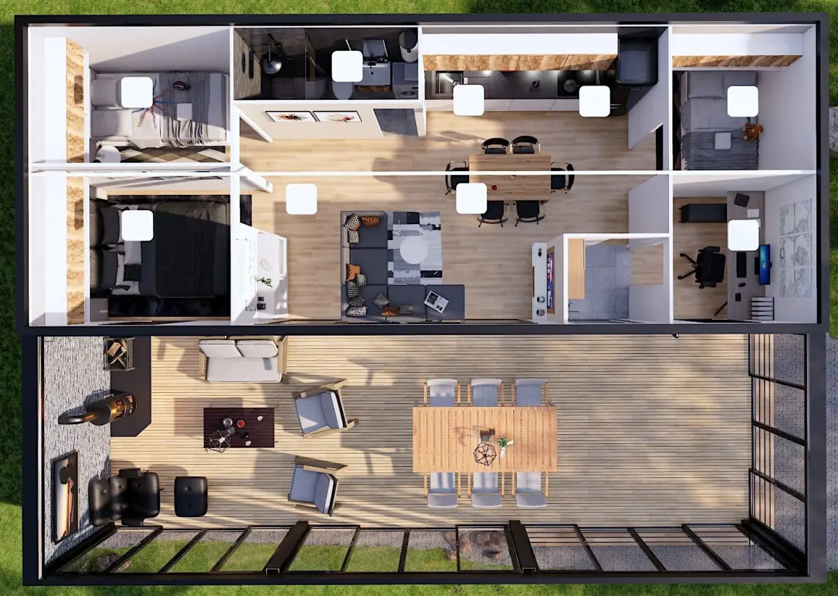 Modern designed mobile home,tiny house, vacation house on 47 m2 with terrace and fully furnished interior. Model is produced in Slovenija by my company and can be ordered and placed any where in europe. Unique designed,modern,highly detailed model with lot of useful 3D models and furniture in it.Model contains house with all the furniture in ,living room,kitchen ,bedroom,bathroom and terrace.additional models (shower,sink,faucet,toilet,bath,sofa,bed TV,outdoor lounge,pots,windows,fireplace..)included. And also lot of decoration that is also included.Link for 360 view tour:https://kuula.co/post/7vyY4/collection/7lvC8 .On the front of the house ,there is big and nice terrace with outdoor furniture .This model have big glass sliding doors.Kitchen is actually designed for a known customer and contains Owen,induction plate ,hood,sink,faucet,decoration... Suitable for sea site area as for the mountain areas and all kind of camping resorts. Model is done with sketch up and rendered with enscape. But best goes with sketch up. 3DS Max users can import sketchup 2008 file format or fbx or obj. All textures appliances and furniture equipment is in high resolution,have been checked and are included in scene.Textures are compresed in zip file.Model is easy to manipulate and ready to render with lumion. Real world scale and exact proportions cm. Realistic and correctly scaled ! • Excellent polygon & texture efficiency Purchasing this model , you get format :skp ,obj,fbx,dwg..or ask designer for different formats.But best goes with sketch up. Additional Textures provided with the model:obj,fbx,dwg,3ds,skp,glb...or ask for any other