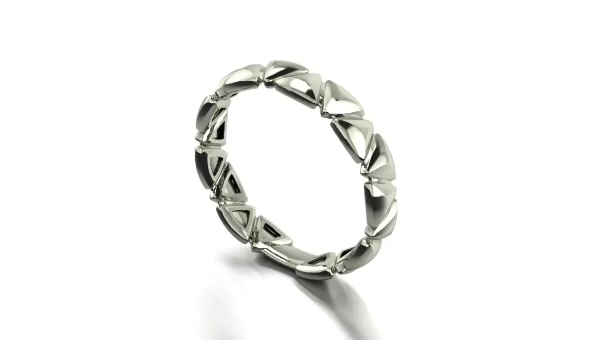 Each segment features sharp, polished planes that reflect light dynamically, giving the ring a bold architectural and contemporary appearance.The modular construction allows easy customization of size, number of segments, and proportions.
