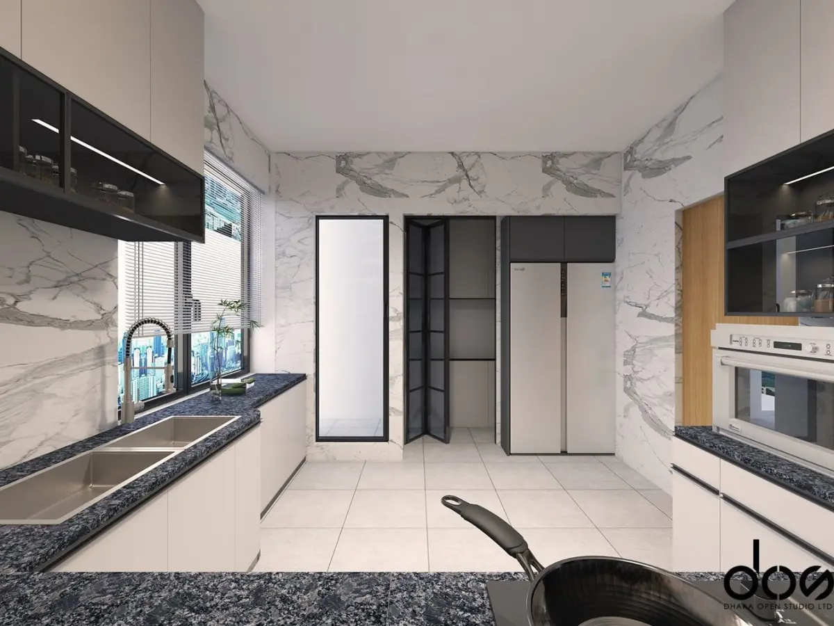 Layout planning: Ensured optimal cabinet and appliance placement for usability.Lighting design: Combined natural and artificial light to create a balanced ambiance.Material selection: High-quality textures were used for surfaces like marble countertops, wood cabinets, and steel appliances.Post-production: Enhanced renders with Photoshop to achieve a photorealistic look.