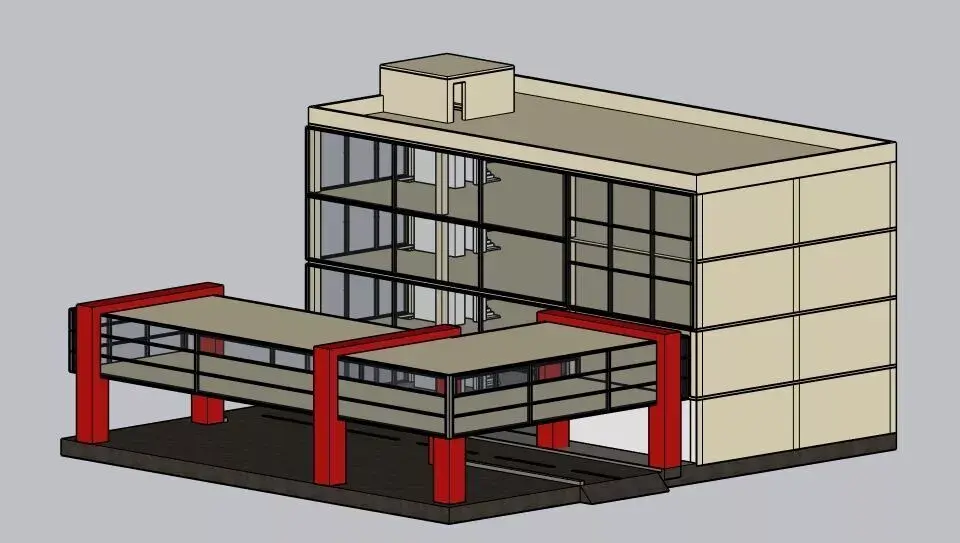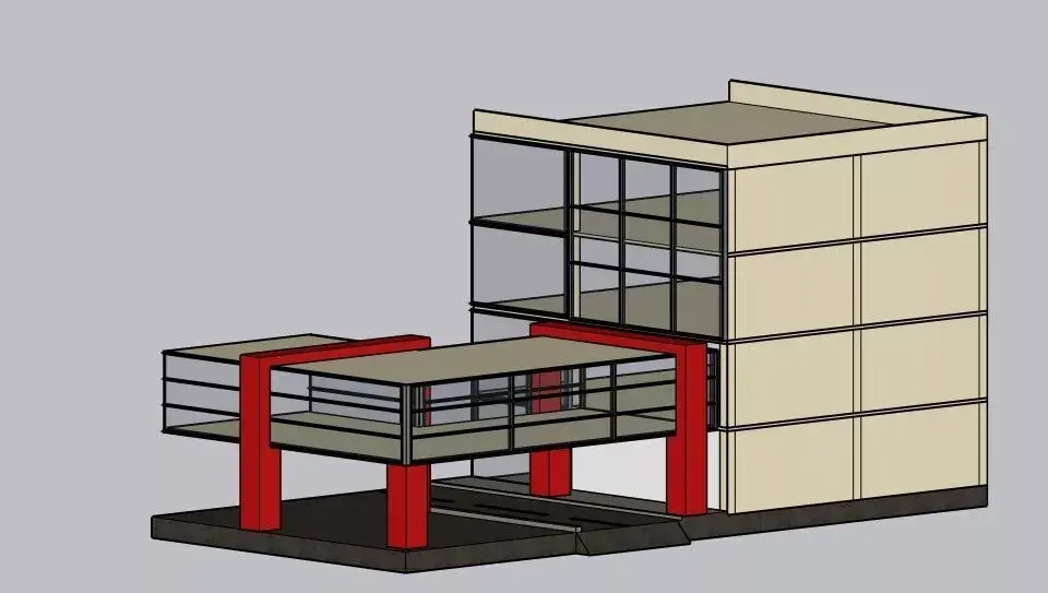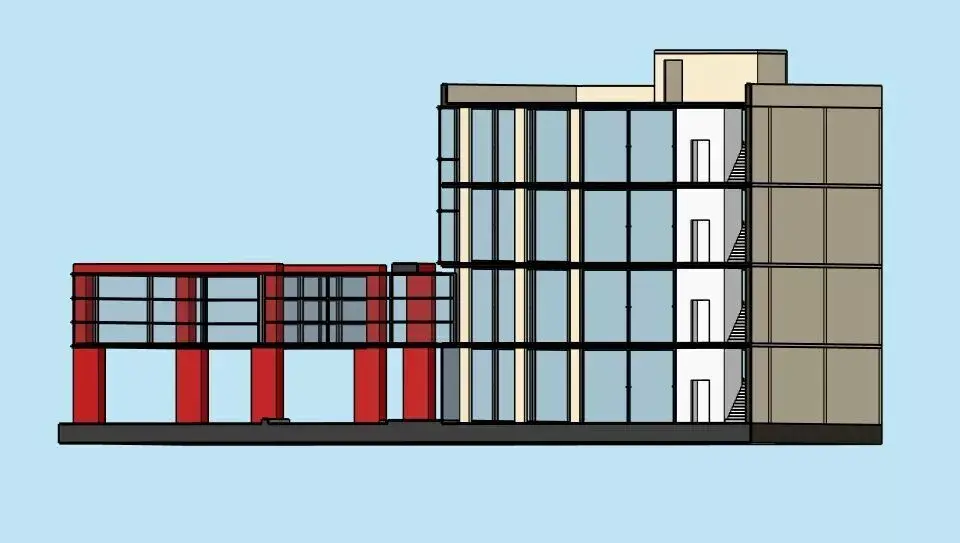 A high-quality 3D model of a modern, multi-storey commercial building featuring a unique architectural style. This model includes a main three-story office block and a distinctive elevated, glass-walled walkway supported by bold red structural pillars. Perfect for architectural visualization, urban planning simulations, or game environments.