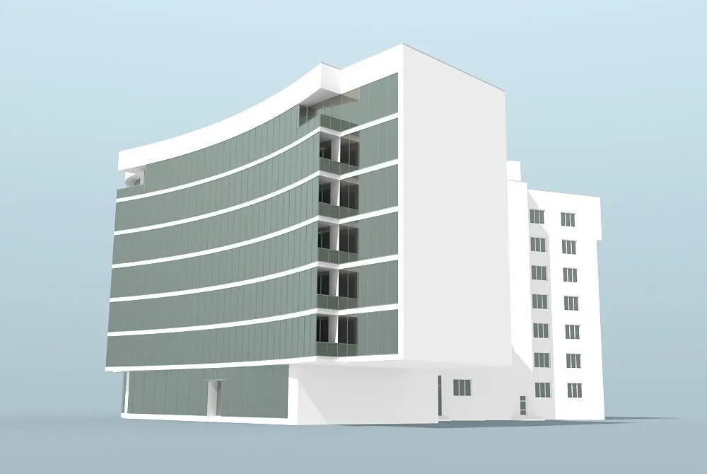 The high-quality 3d model of a office building, along with several surrounding buildings.