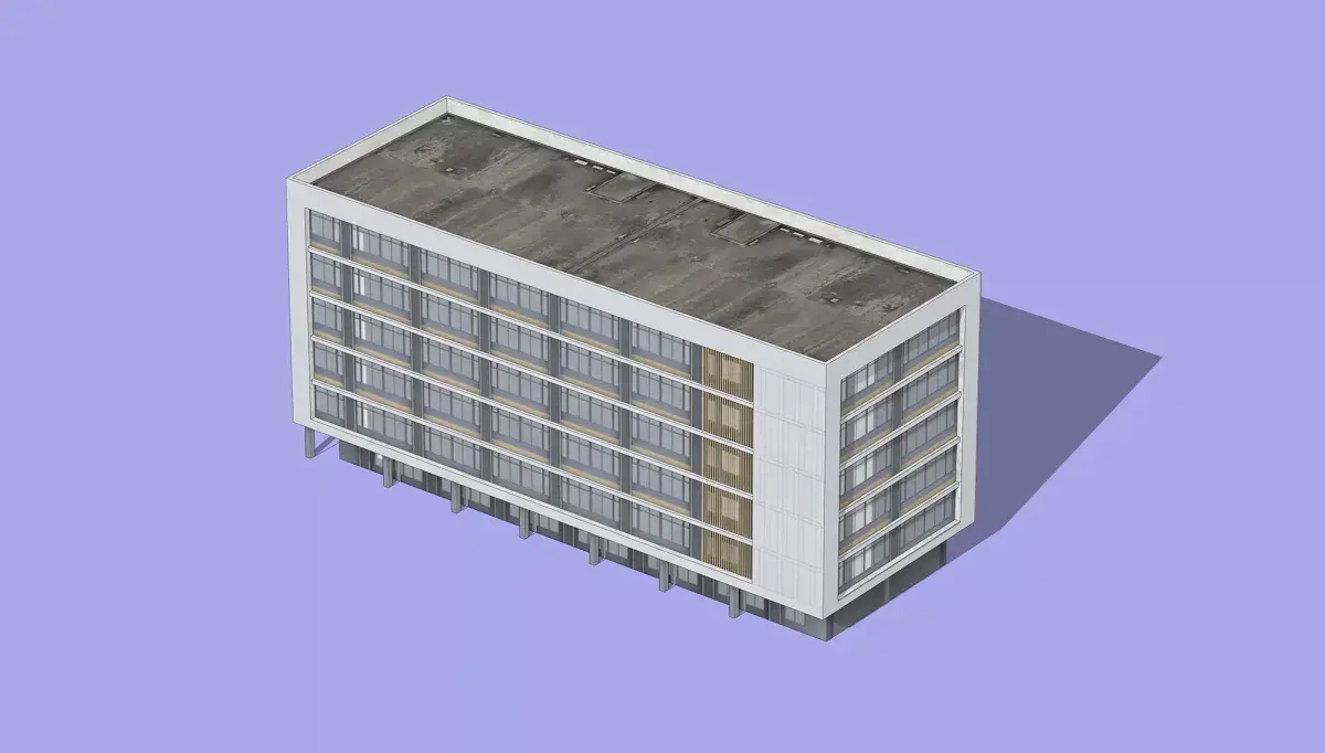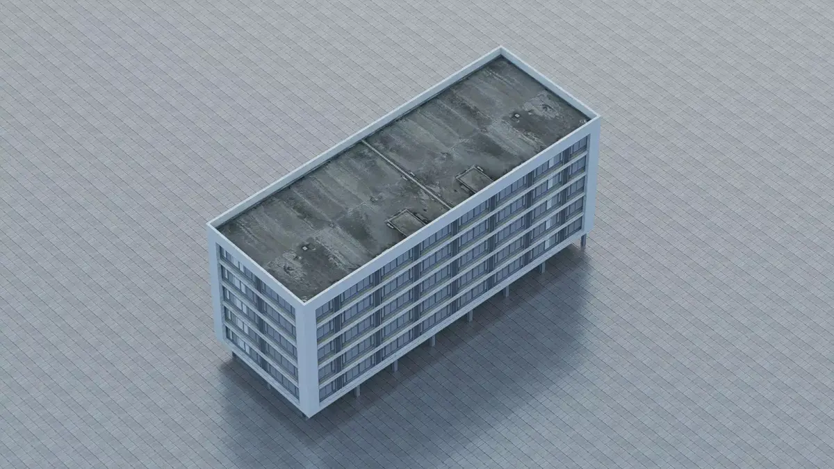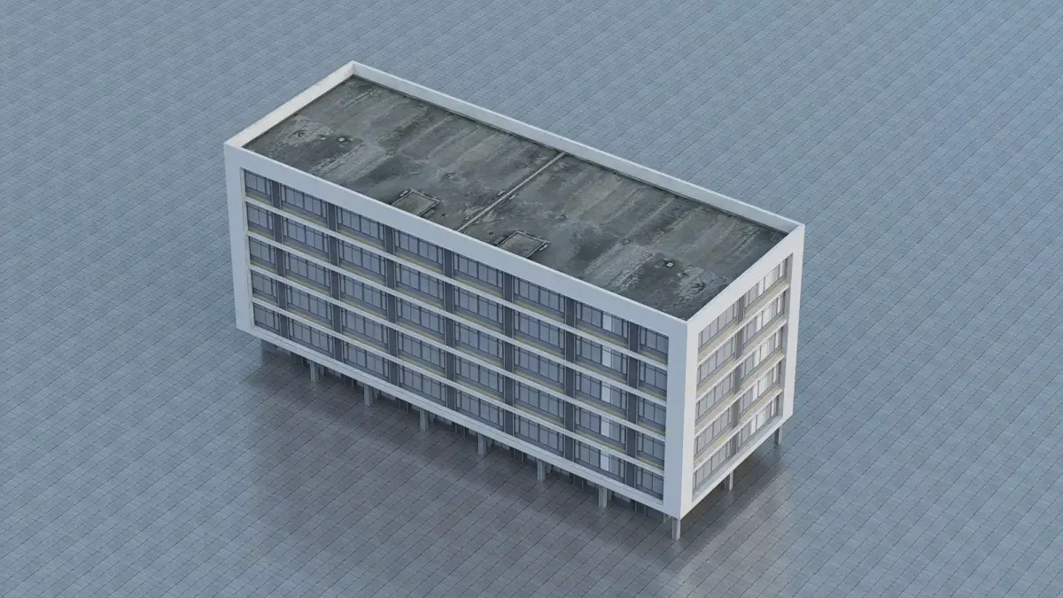 This 3D low-poly model represents a modern multi-story office building, showcasing a design that blends minimalism with functional aesthetics. The structure features a clean, rectangular geometric silhouette, with a facade dominated by a grid of regularly arranged windows, evoking a sense of order and urban modernity. The building is elevated on stilts at the base, enhancing its sense of openness and visual hierarchy. A section of the exterior is accented with wooden or latticed textures, adding visual interest and breaking the monotony of the white walls. The flat roof design is characteristic of contemporary commercial architecture. Despite its low polygon count, the model is detailed and well-crafted, making it highly suitable for urban planning visualizations, game environment construction, architectural presentations, and various digital media productions.