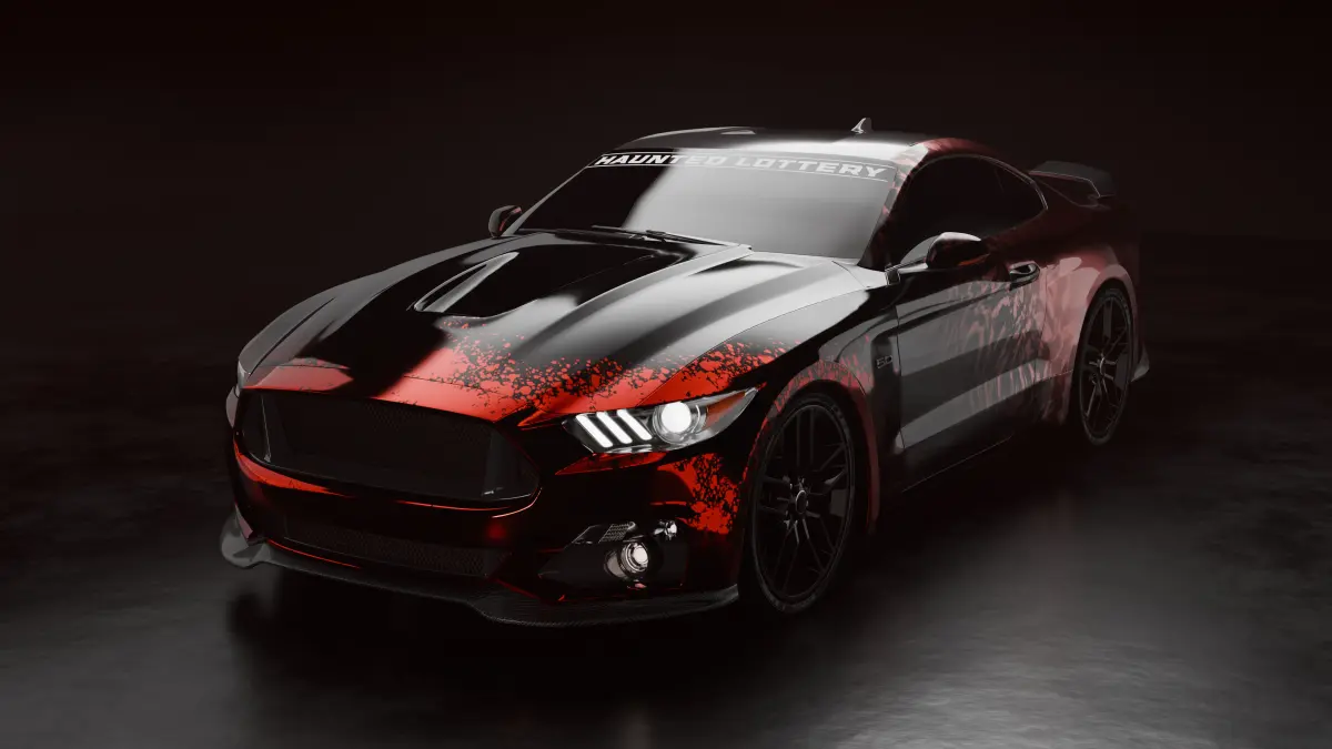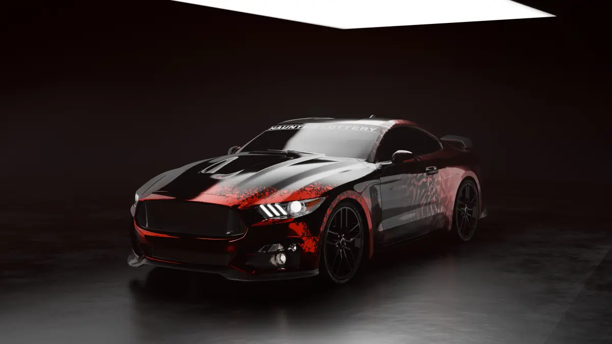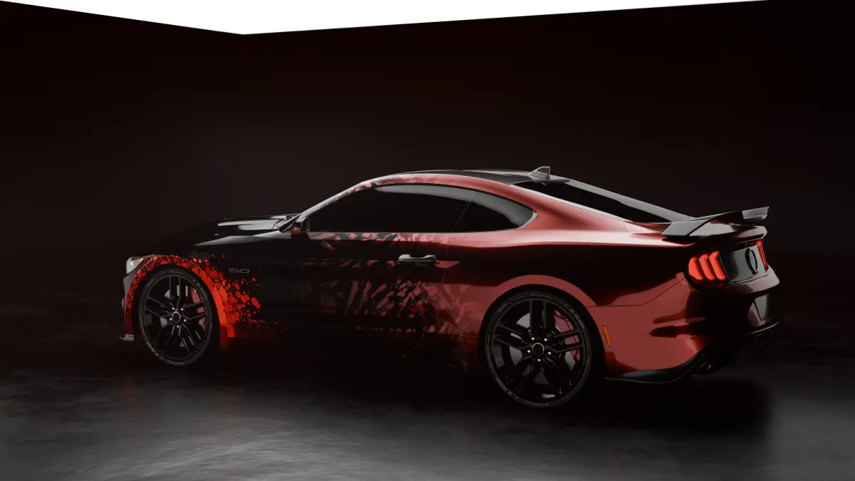 Presenting a stunning 3D render of a sleek, modern sports car. This model showcases a distinctive design with a striking combination of black and red paint, featuring a unique pattern that resembles splashes or abstract art. The car's sharp lines and glossy finish are highlighted against a dark background, making it perfect for showcasing the vehicle's bold and aggressive look. This render is ideal for car enthusiasts and potential buyers seeking a unique and eye-catching design.with customizable colour and material.