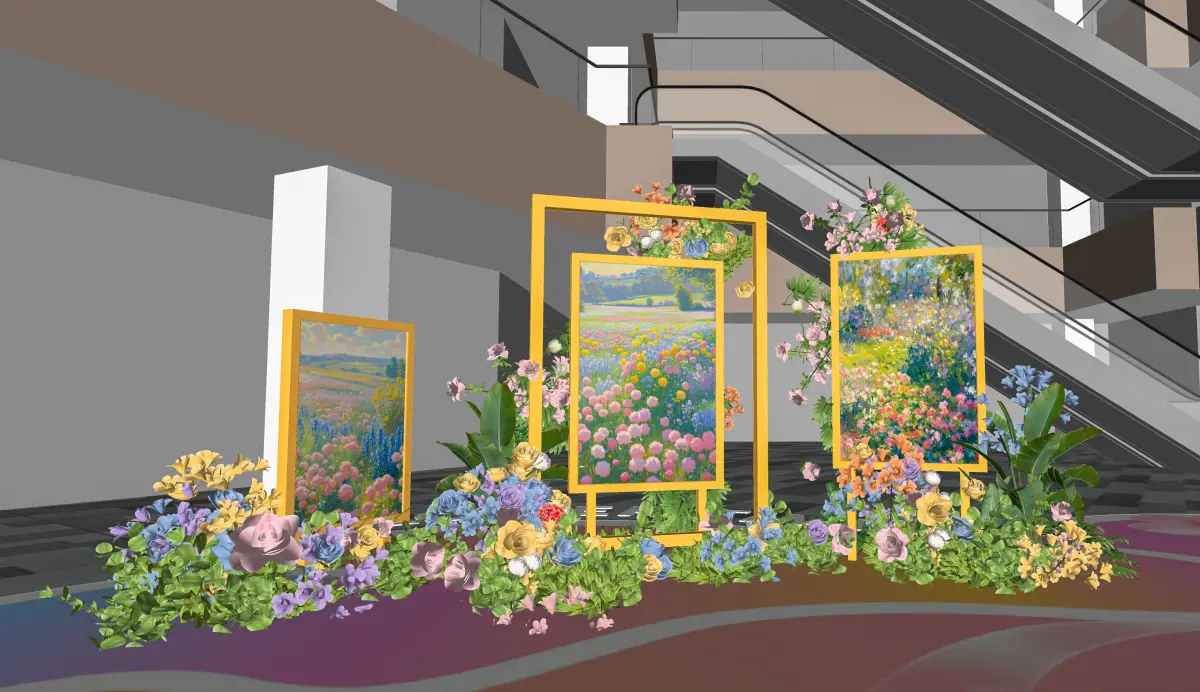 Inspired by frame scenery grows flowers, Meichen has three sets of special-shaped wooden picture frames suspended in front of the meter-white rammed earth wall. The main frame adopts the shape of a moon-hole with a tenon and tenon structure. The deep brown walnut frame is embedded with ice cracked glass. The interior is made of simulated peonies and phalaenopsis to create a three-dimensional flower waterfall. Copper vines are wrapped between the pink and white petals, and the LED dimples on the leaves. Lights shine like morning dew. The rectangular frames on both sides are based on hollow landscape patterns, lavender lily of the valley and bamboo lanterns hang from the left frame, and the Spring Mountain background is covered with immortal moss on the right side, paired with detachable calligraphy scroll props. The bluestone floor in front of the frame is carved with plum blossoms stepping stones, and the brass censer shaped flower utensils in the corner are filled with silver willows and wintersweet blossoms. The oil-paper umbrella-shaped chandelier hanging from the top shines warm light. When tourists walk into the picture frame, the mirror reflection overlaps with the flower shadows, forming a check-in scene of the person is in the painting, the painting moves with the person, combining the elegance of the new Chinese style and spring flowers. Condensing into an interactive aesthetic device.