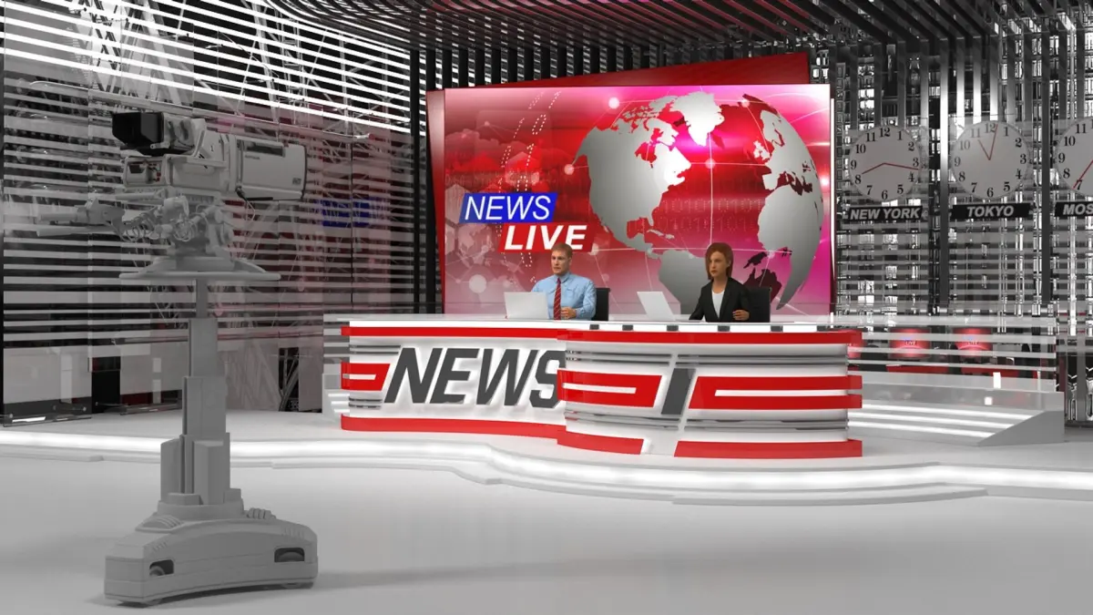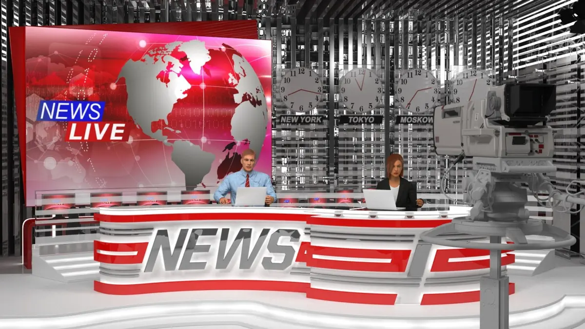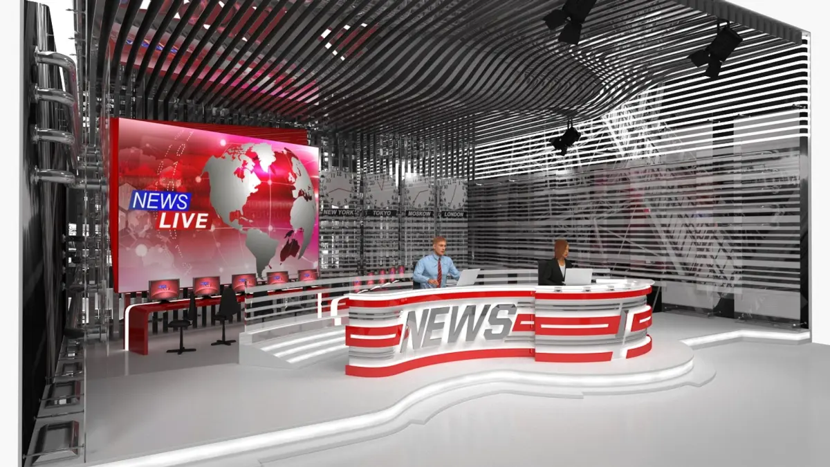 For television broadcasting, media production, film and TV studios, digital media agencies, virtual event environments, news set design, journalism education, live streaming setups, corporate communications projects, and virtual broadcasting demonstrations marketing, or promotional projects.