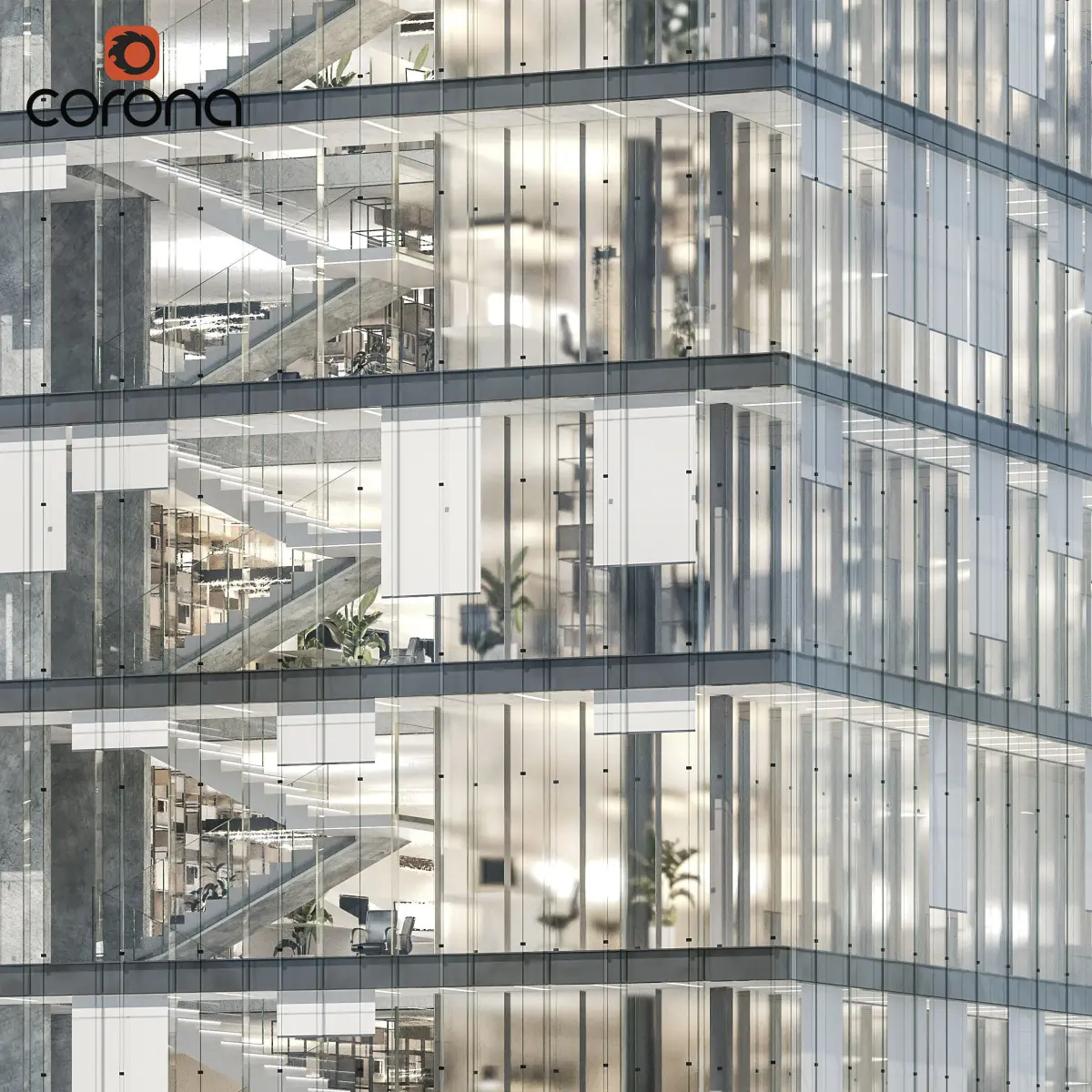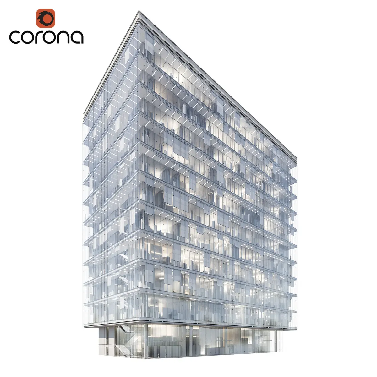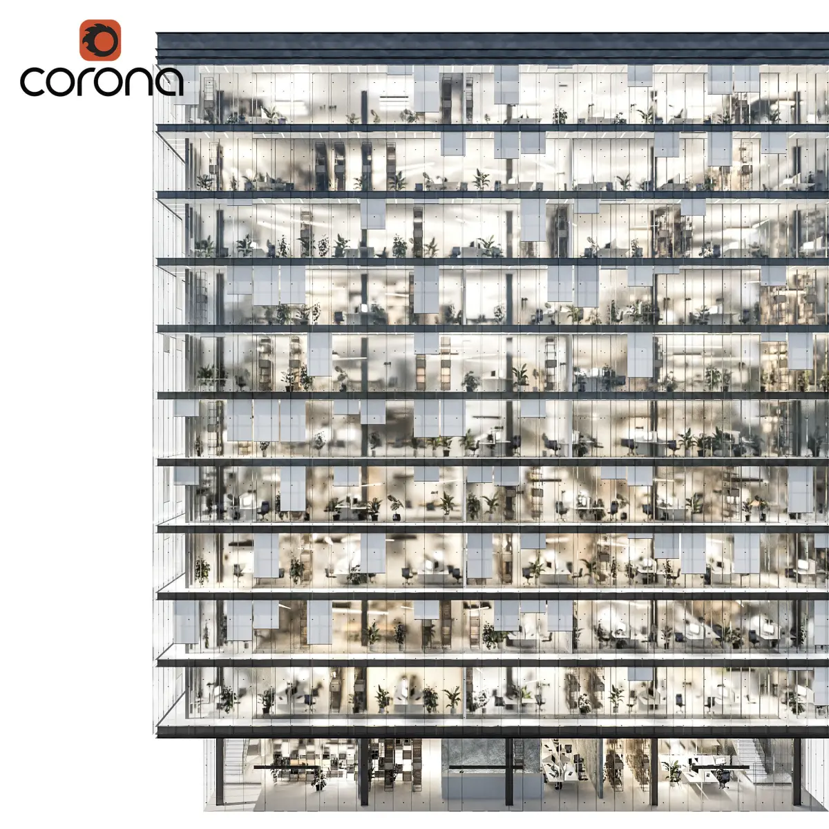 Interiors are 3-dimensional (walls) with various furniture as textures on planes (plants, lamps, desks etc.) and with most lights on (for night renders).