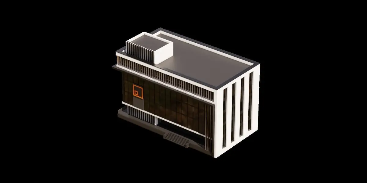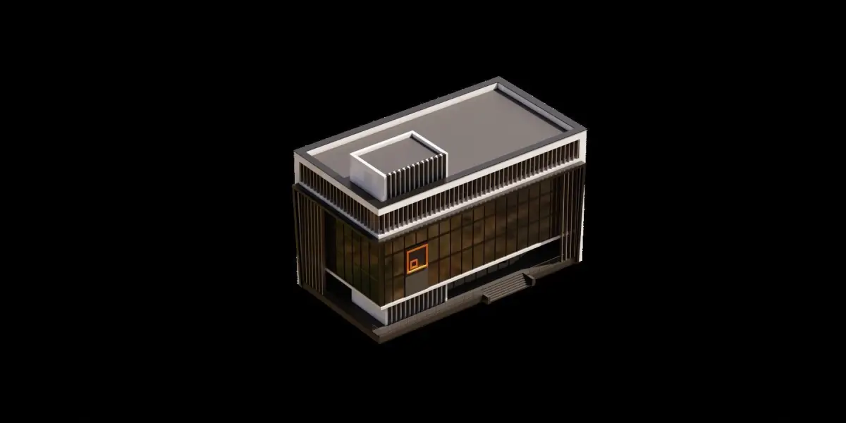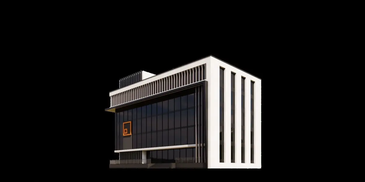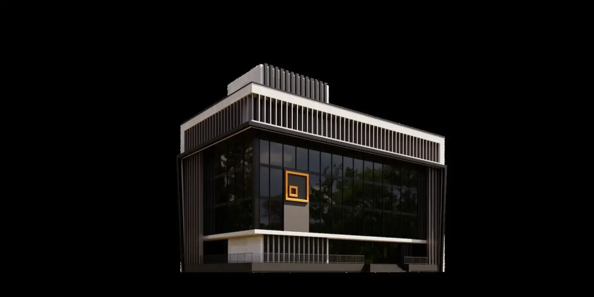 Modern building with a unique design. The building has a black and white color scheme, and it is adorned with many windows. The windows are arranged in a pattern, with some being larger and others smaller. The building's facade is also decorated with yellow squares, adding a pop of color to the otherwise monochromatic structure. The overall design of the building is visually striking and likely serves as a prominent landmark in the area.