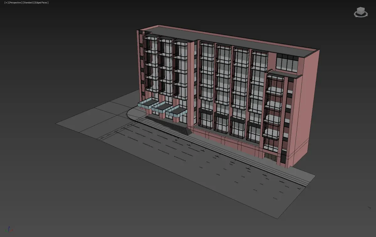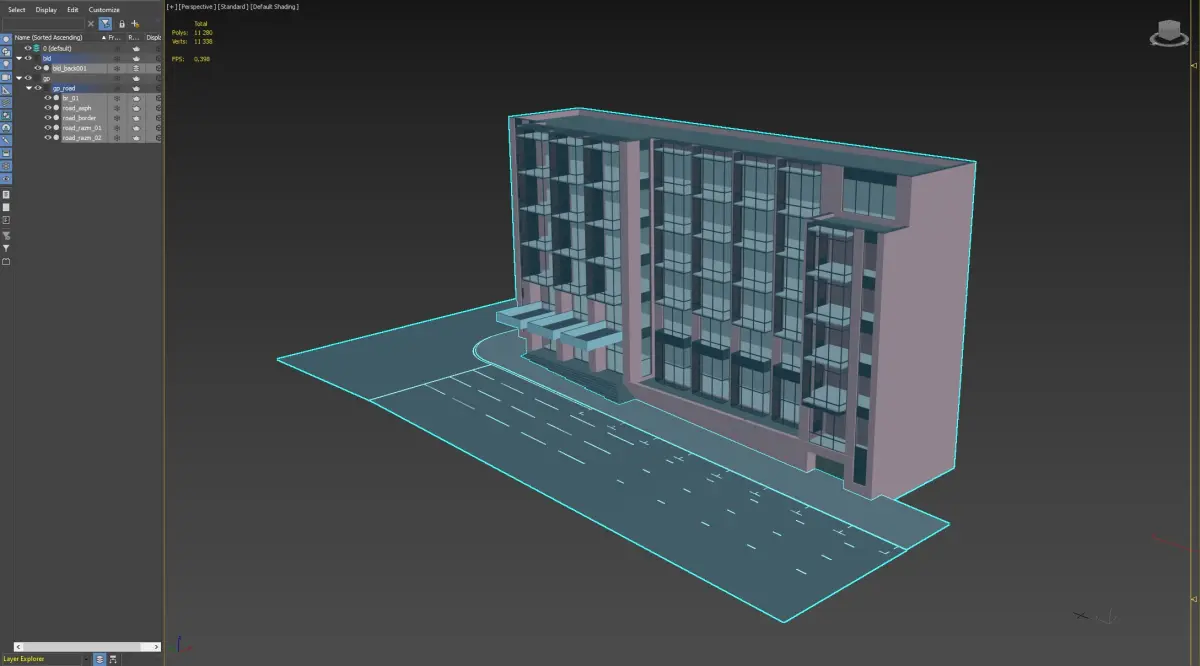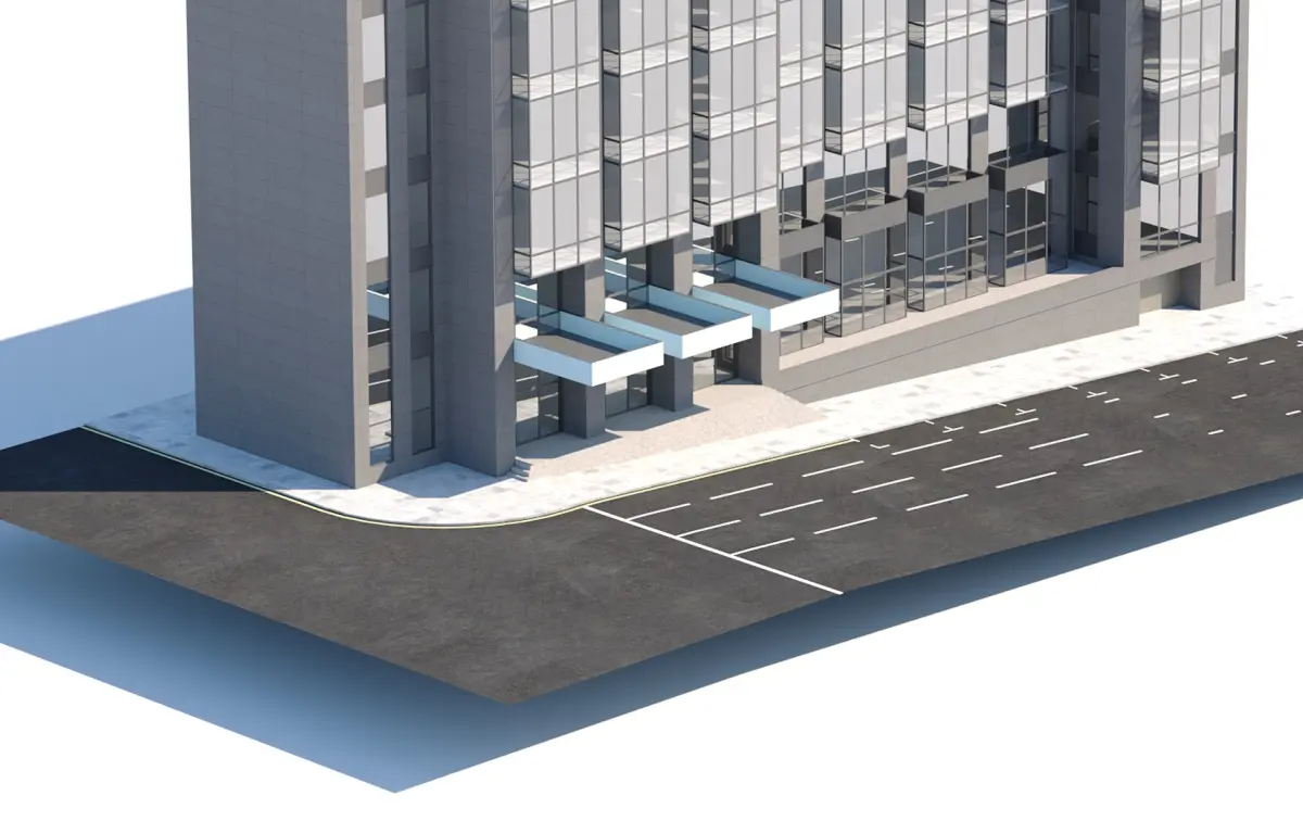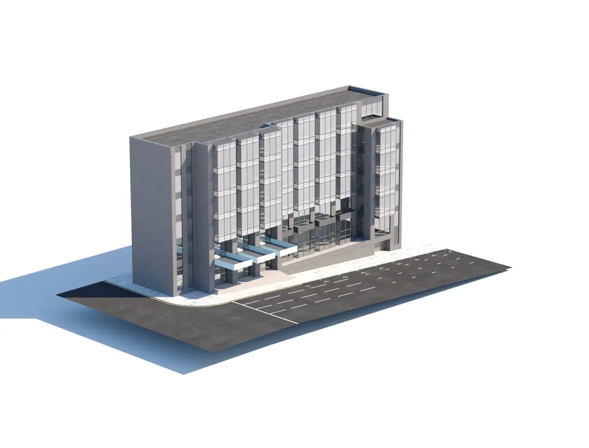 A realistic modern office building with detailed glass facades, parking lot, and street elements. Ideal for architectural visualizations and urban projects.